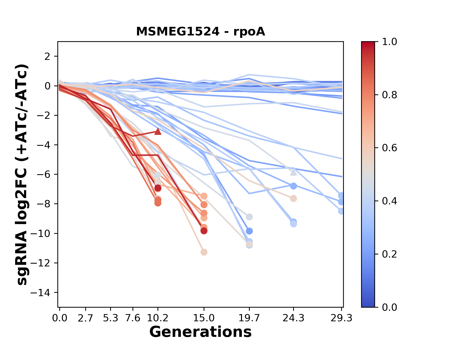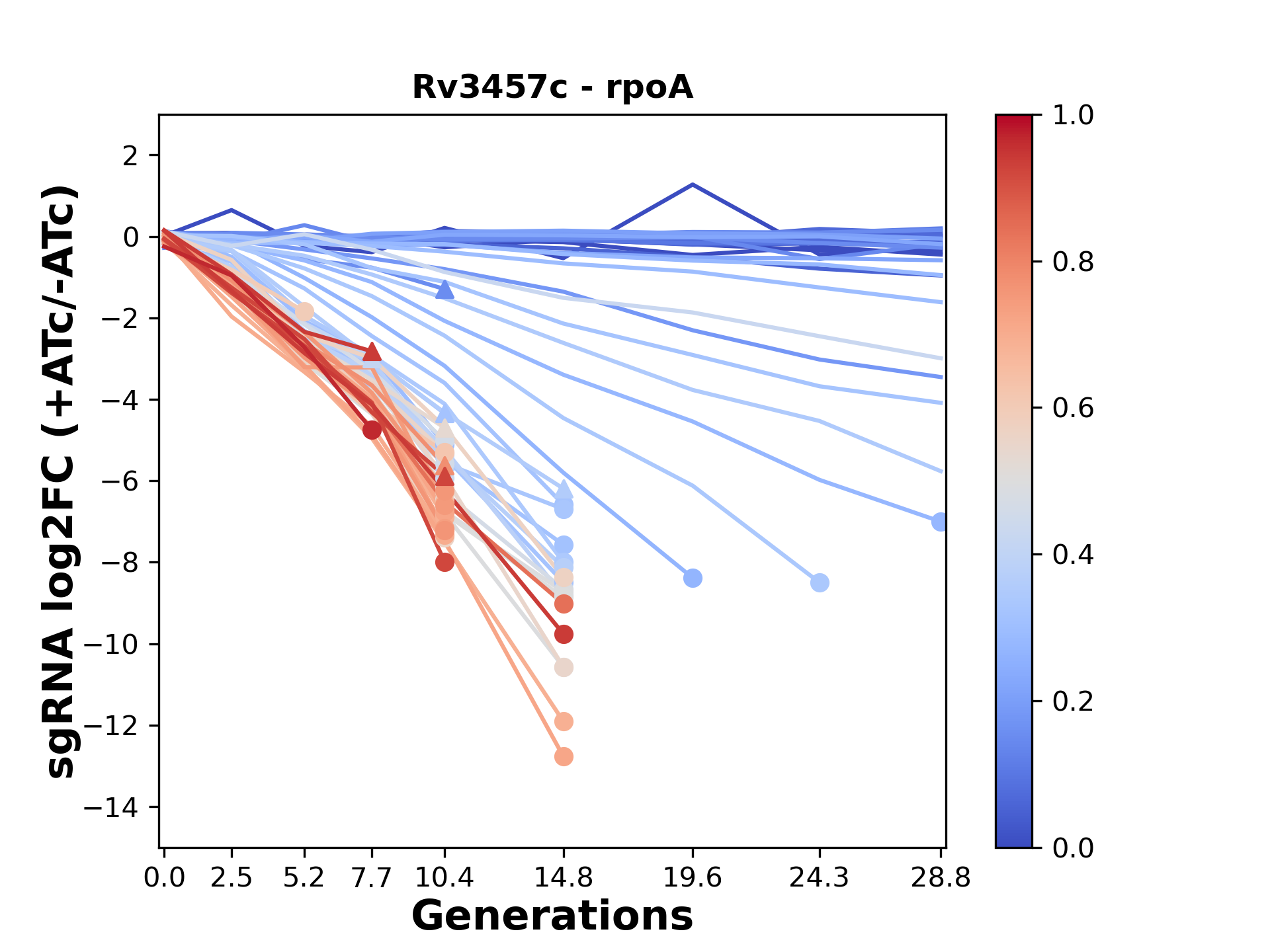 Here, we show sgRNA log2 fold-change values (L2FC) (plus versus minus ATc) over consecutive generations for sgRNAs targeting the gene you selected.