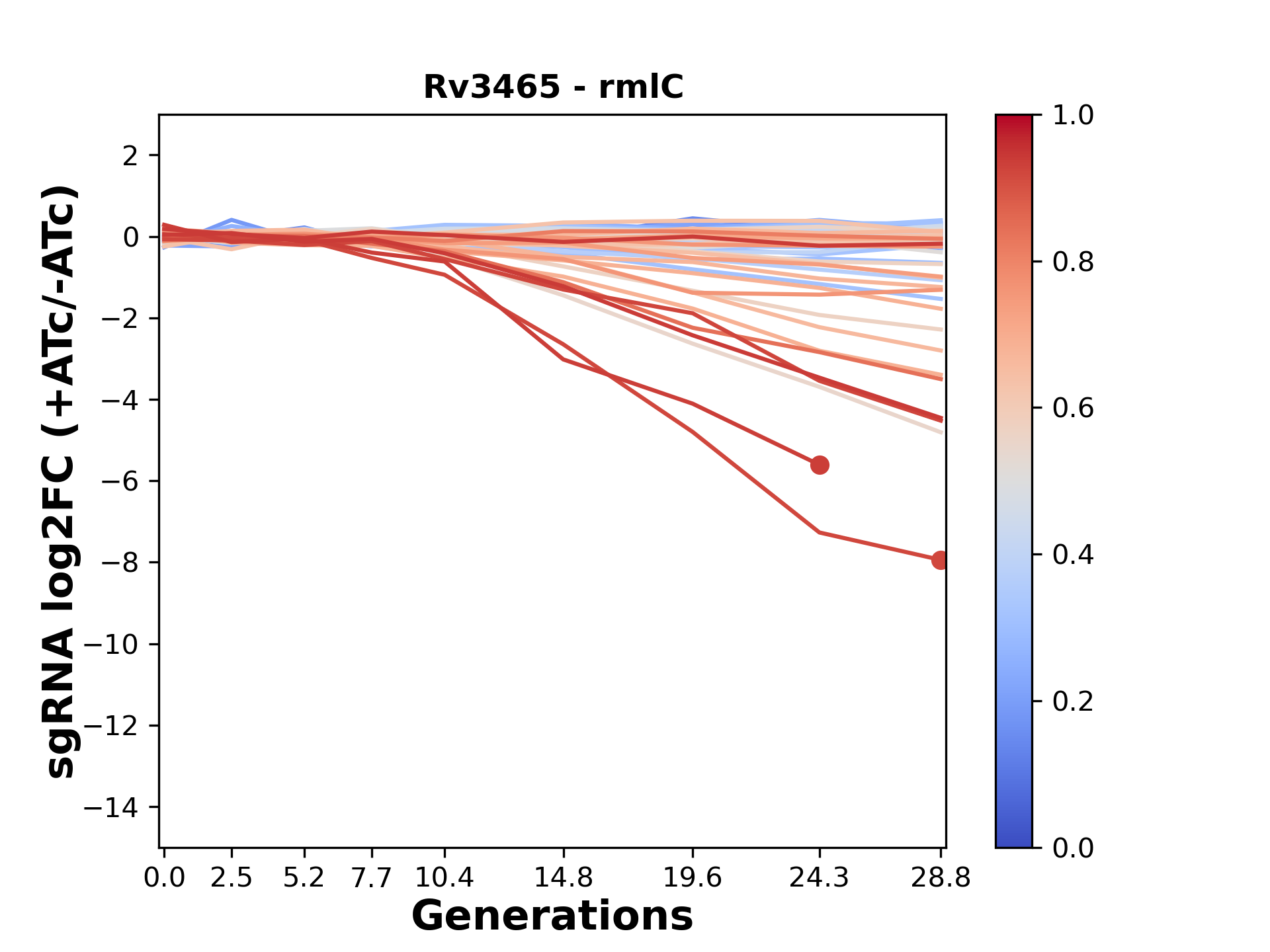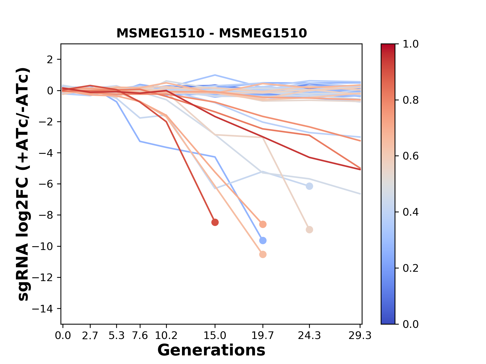 Here, we show sgRNA log2 fold-change values (L2FC) (plus versus minus ATc) over consecutive generations for sgRNAs targeting the gene you selected.