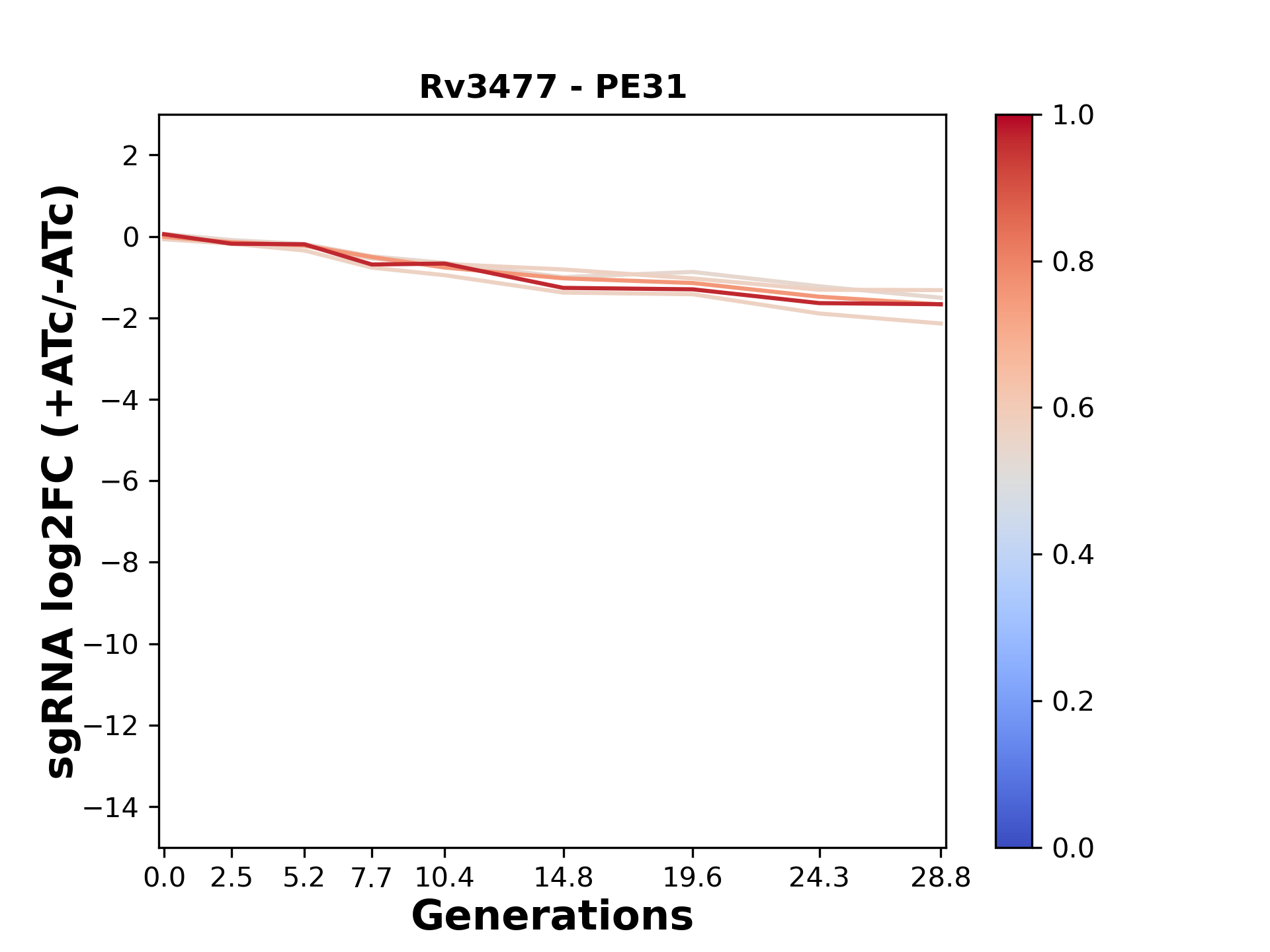 Here, we show sgRNA log2 fold-change values (L2FC) (plus versus minus ATc) over consecutive generations for sgRNAs targeting the gene you selected.