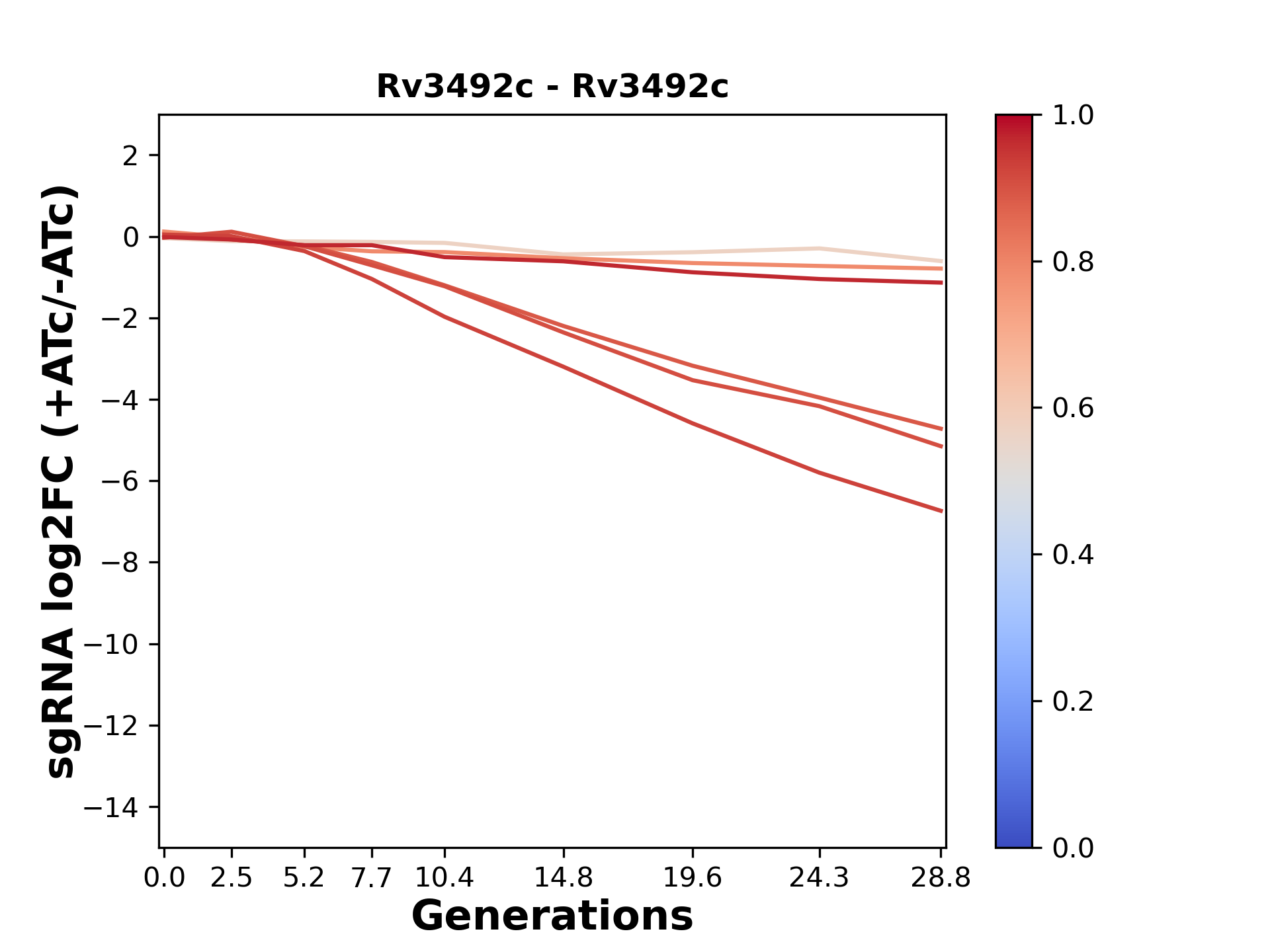 Here, we show sgRNA log2 fold-change values (L2FC) (plus versus minus ATc) over consecutive generations for sgRNAs targeting the gene you selected.