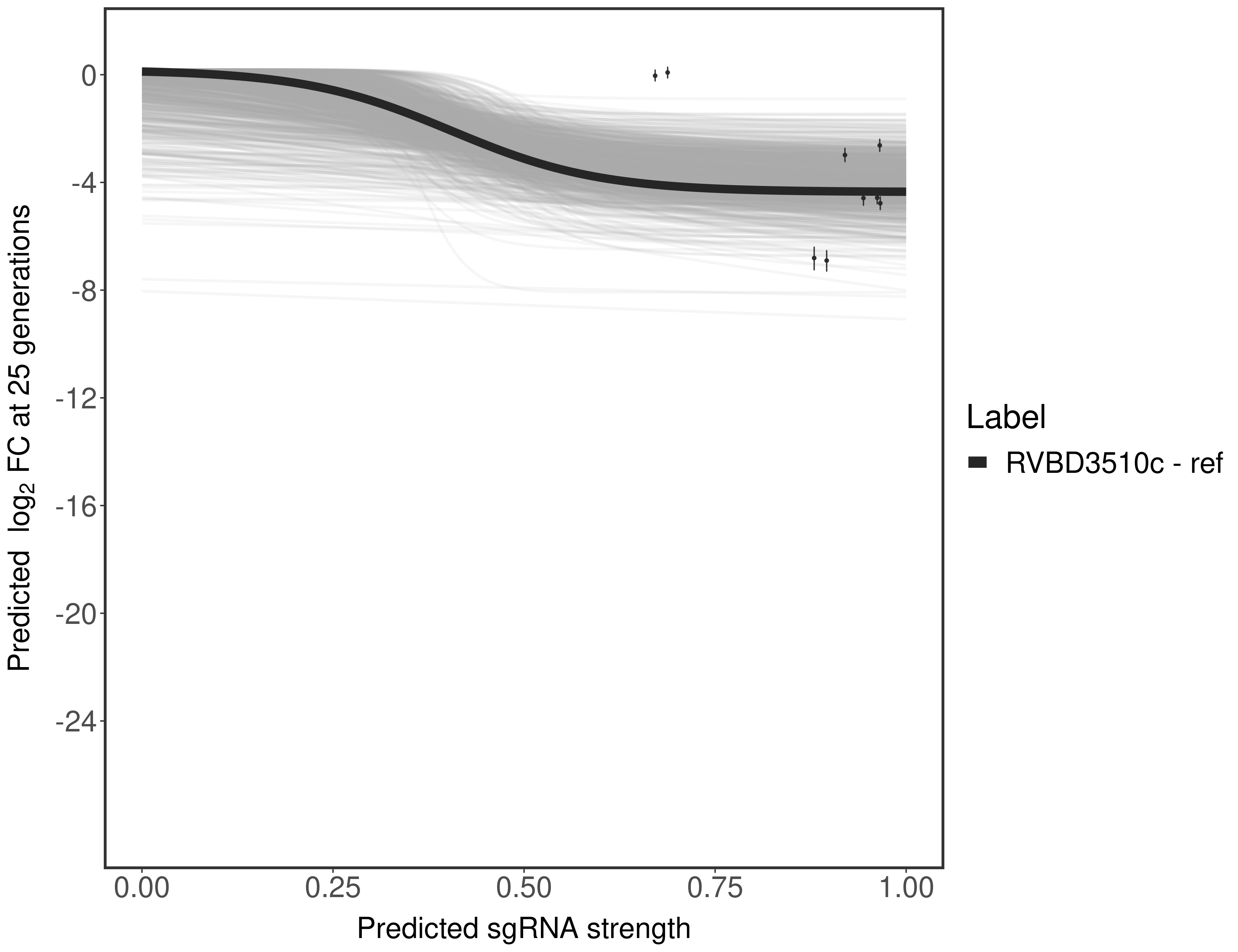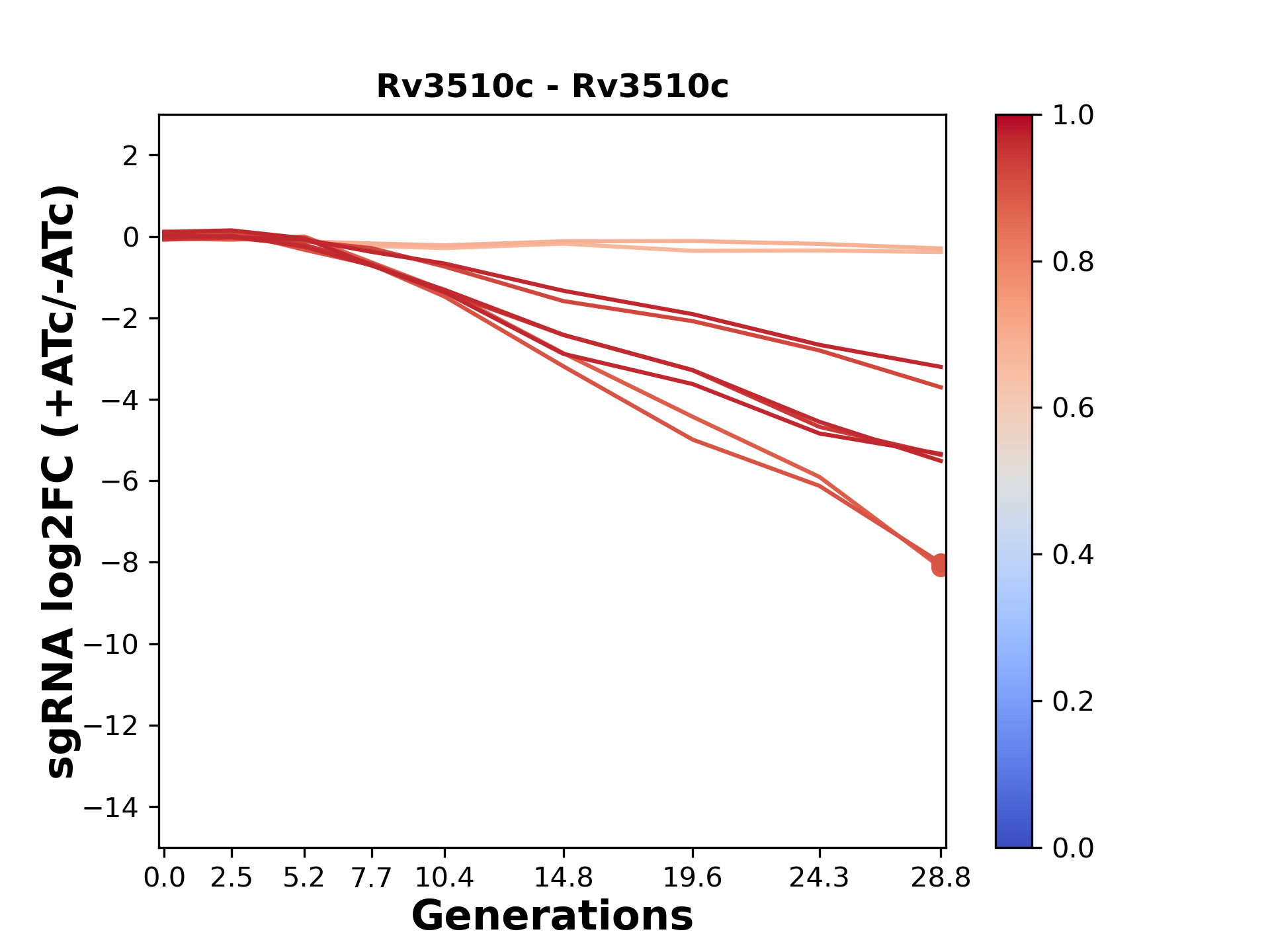 Experiment: We designed an M. tuberculosis CRISPRi library (RLC12) to target all annotated Mtb genes with single guide RNAs (sgRNAs) of varying predicted knockdown efficiencies. In parallel, we constructed a M. smegmatis CRISPRi library (RLC11) to target all annotated Msmeg genes, similar to the Mtb sgRNA library. RLC12 was transformed into M. tuberculosis H37Rv; RLC11 into M. smegmatis mc2-155. We passaged both CRISPRi libraries for nearly 30 generations in the presence or absence of the CRISPRi-inducer anhydrotetracycline (ATc). At the indicated timepoints, genomic DNA was harvested and the representation of individual sgRNAs was counted using Illumina sequencing. Here, we show sgRNA log2 fold-change values (L2FC) (plus versus minus ATc) over consecutive generations for sgRNAs targeting the gene you selected. sgRNAs are color-coded based on their predicted strength from blue (strength=0; weak) to red (strength=1; strong).