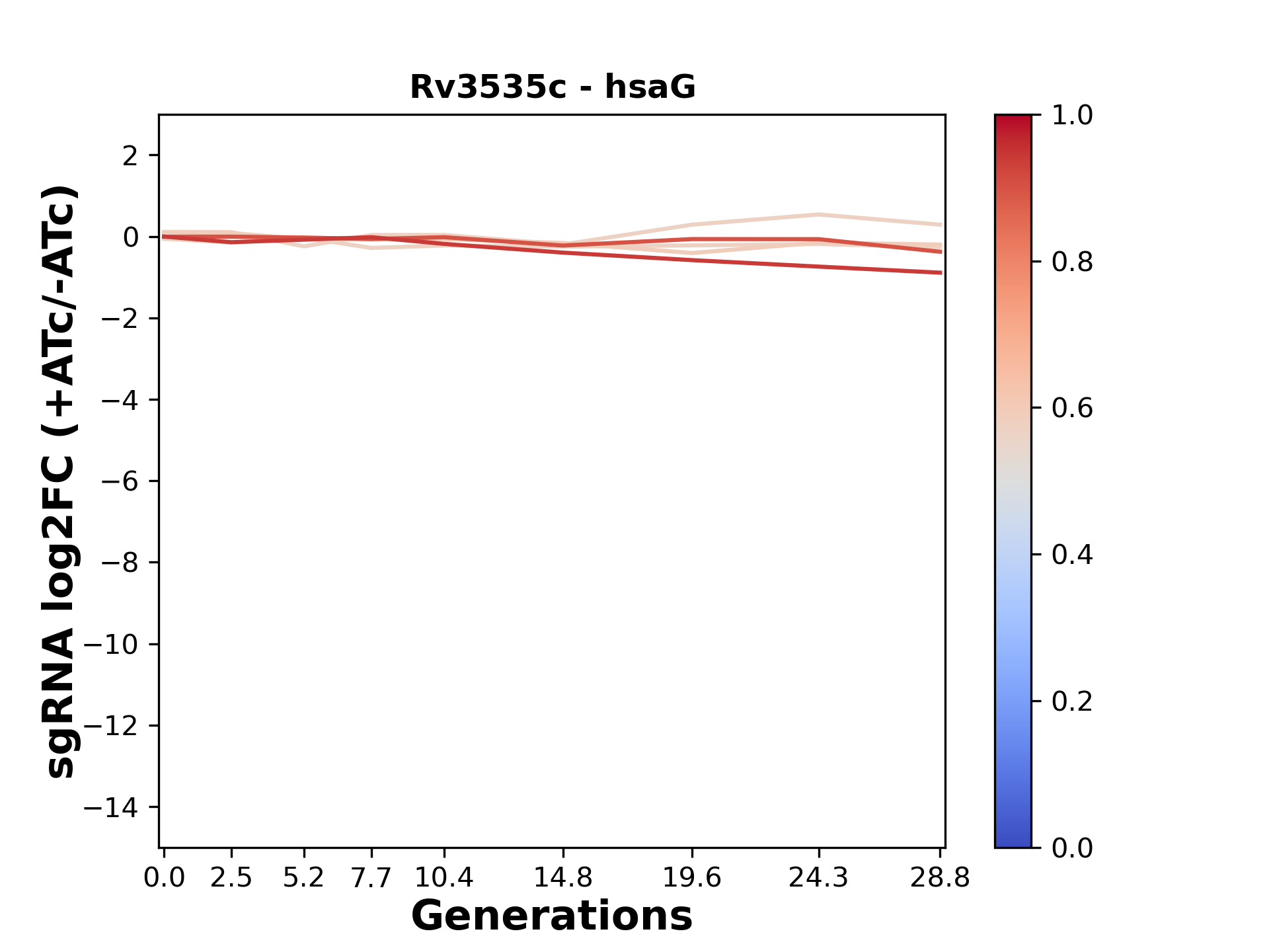 Experiment: We designed an M. tuberculosis CRISPRi library (RLC12) to target all annotated Mtb genes with single guide RNAs (sgRNAs) of varying predicted knockdown efficiencies. In parallel, we constructed a M. smegmatis CRISPRi library (RLC11) to target all annotated Msmeg genes, similar to the Mtb sgRNA library. RLC12 was transformed into M. tuberculosis H37Rv; RLC11 into M. smegmatis mc2-155. We passaged both CRISPRi libraries for nearly 30 generations in the presence or absence of the CRISPRi-inducer anhydrotetracycline (ATc). At the indicated timepoints, genomic DNA was harvested and the representation of individual sgRNAs was counted using Illumina sequencing. Here, we show sgRNA log2 fold-change values (L2FC) (plus versus minus ATc) over consecutive generations for sgRNAs targeting the gene you selected. sgRNAs are color-coded based on their predicted strength from blue (strength=0; weak) to red (strength=1; strong).