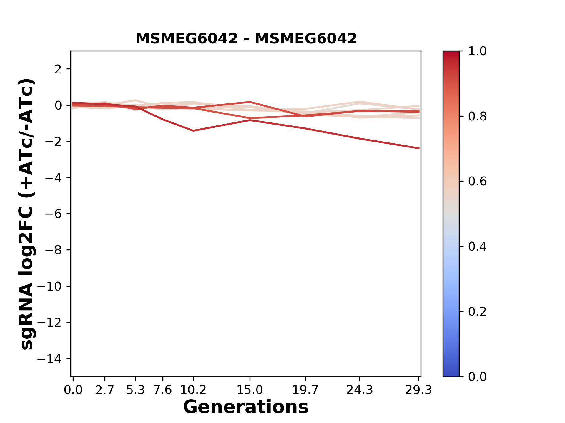 Here, we show sgRNA log2 fold-change values (L2FC) (plus versus minus ATc) over consecutive generations for sgRNAs targeting the gene you selected.