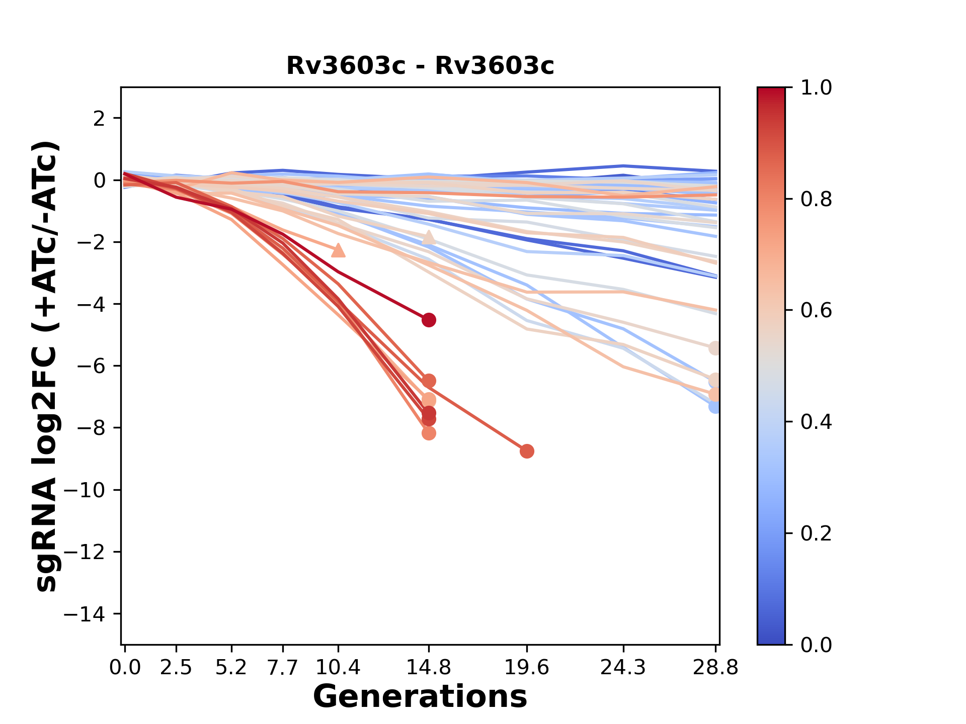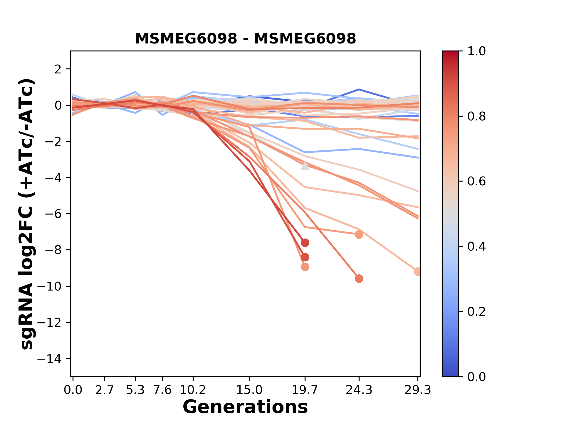 Here, we show sgRNA log2 fold-change values (L2FC) (plus versus minus ATc) over consecutive generations for sgRNAs targeting the gene you selected.