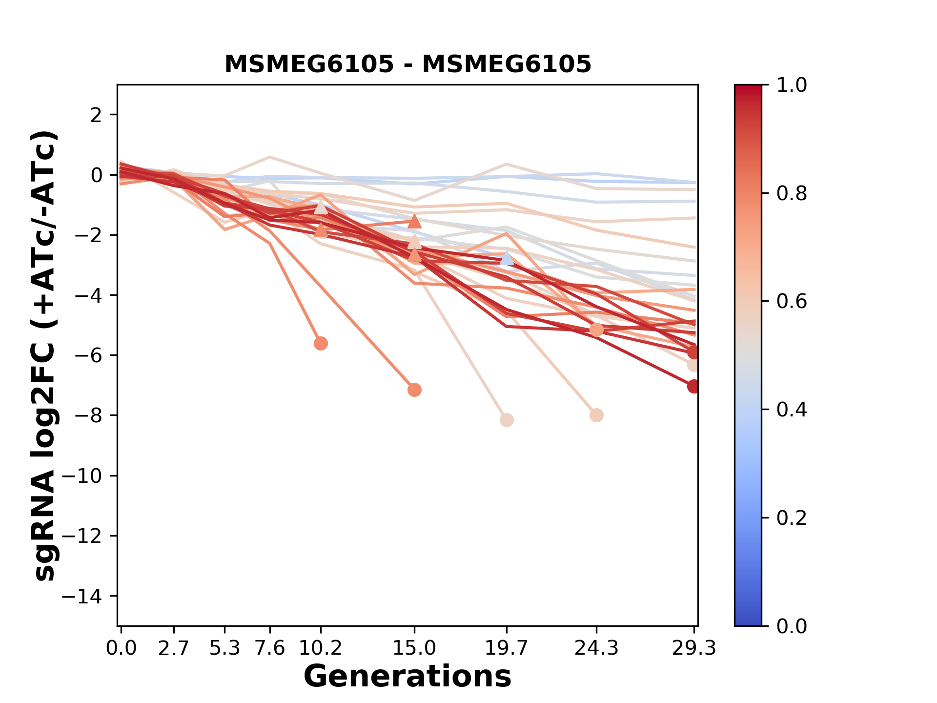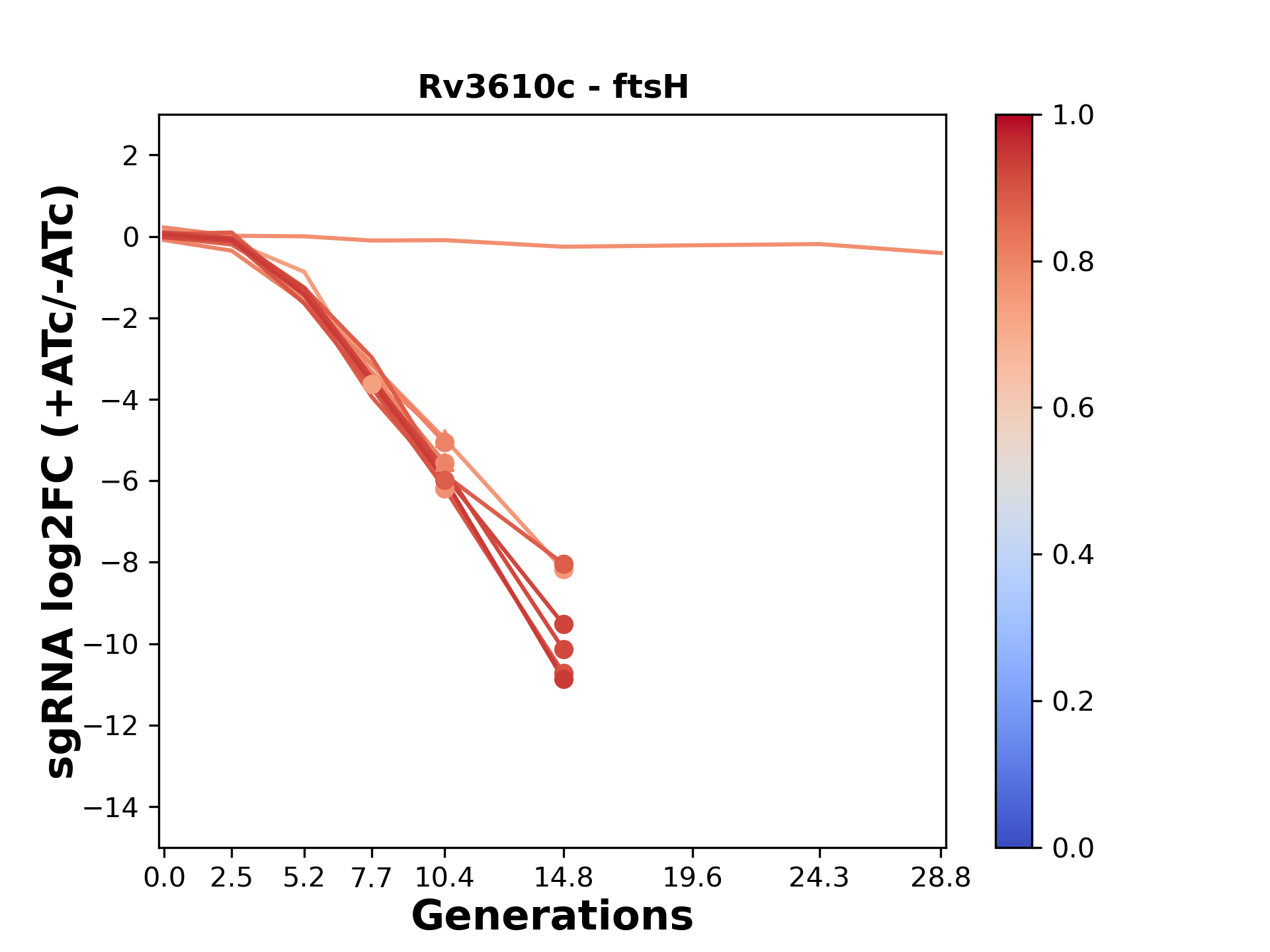 Here, we show sgRNA log2 fold-change values (L2FC) (plus versus minus ATc) over consecutive generations for sgRNAs targeting the gene you selected.