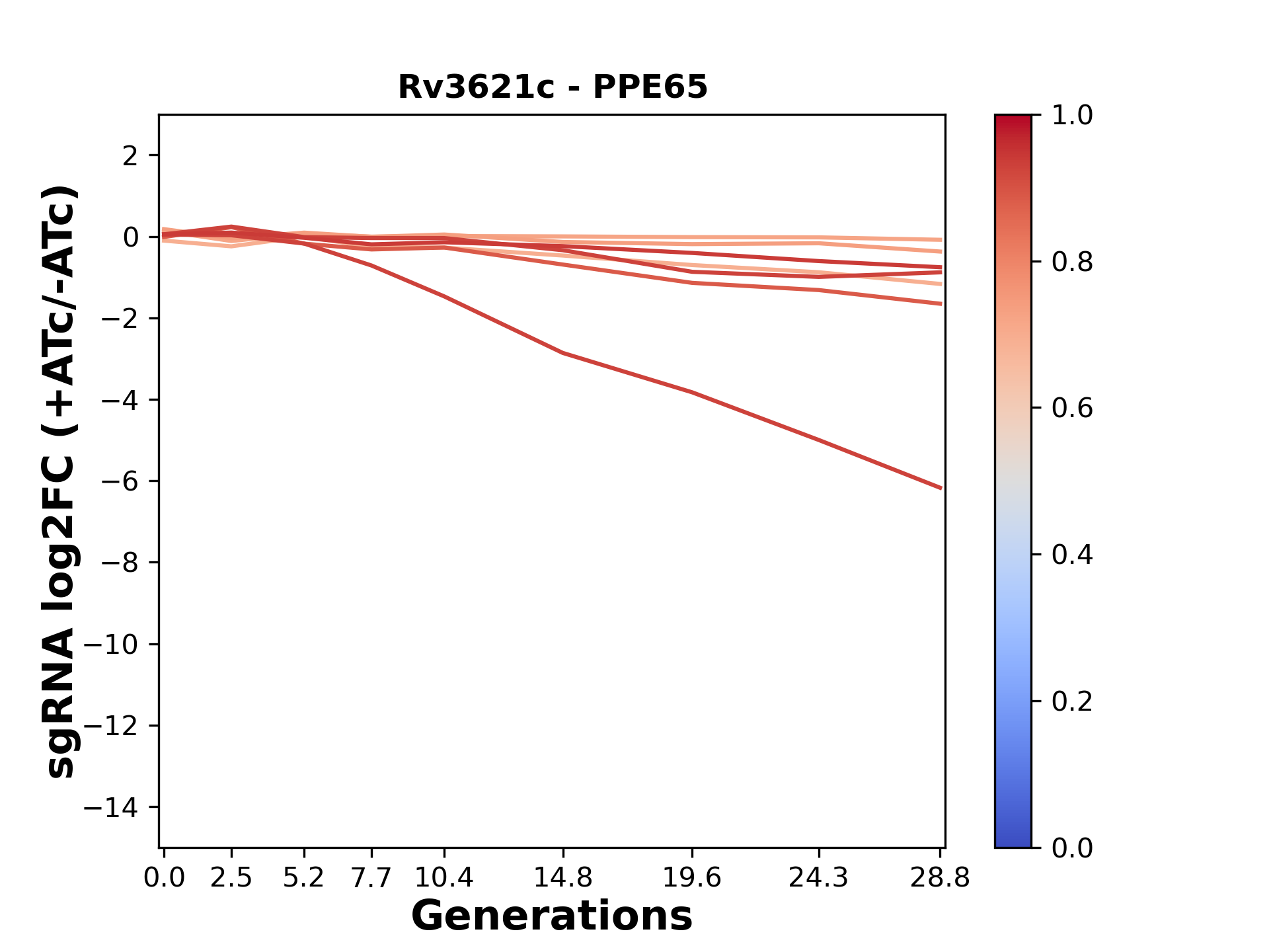 Here, we show sgRNA log2 fold-change values (L2FC) (plus versus minus ATc) over consecutive generations for sgRNAs targeting the gene you selected.