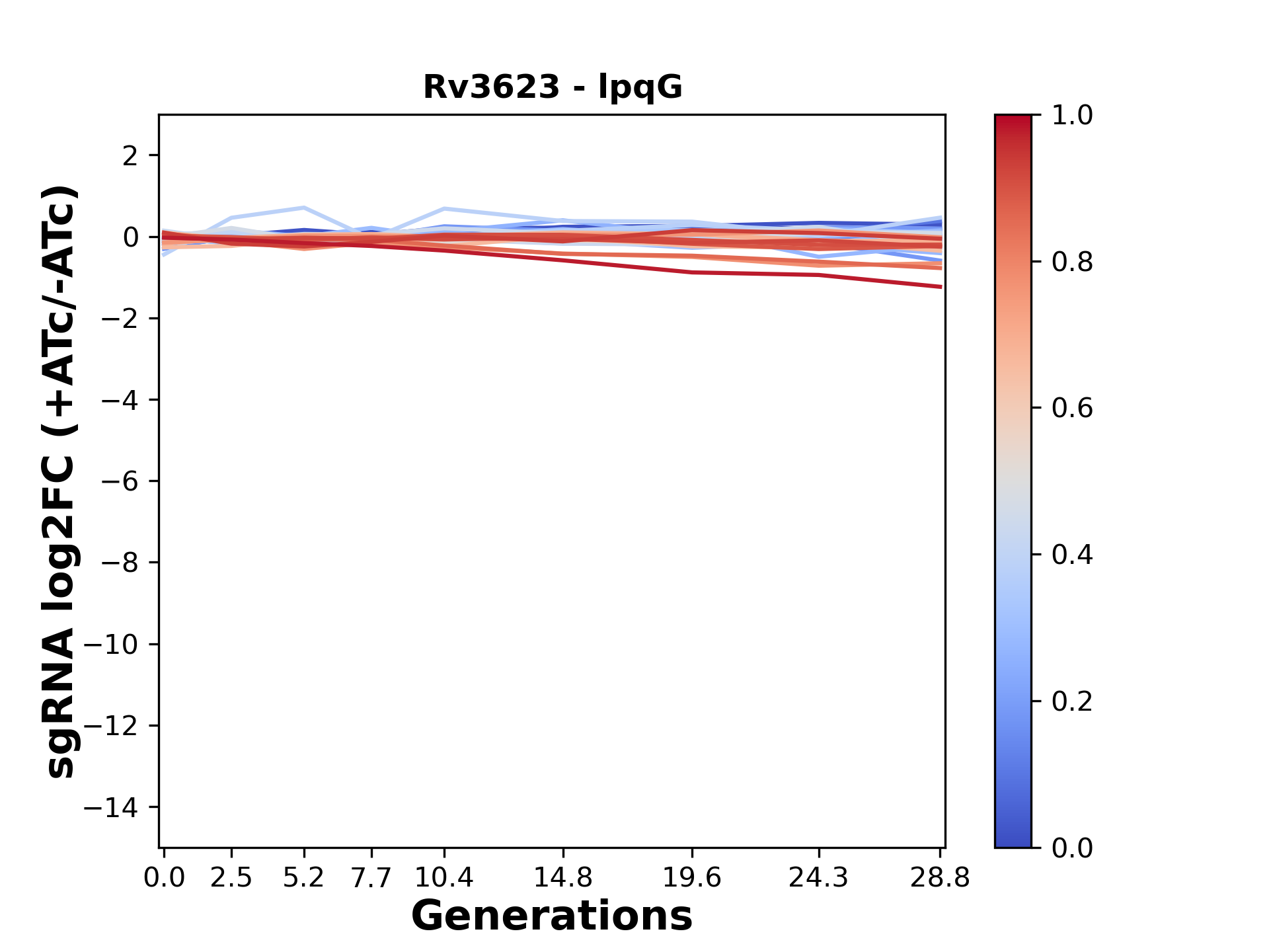 Here, we show sgRNA log2 fold-change values (L2FC) (plus versus minus ATc) over consecutive generations for sgRNAs targeting the gene you selected.
