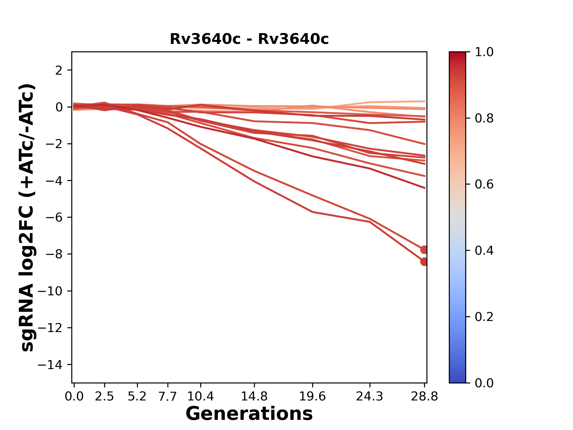 Here, we show sgRNA log2 fold-change values (L2FC) (plus versus minus ATc) over consecutive generations for sgRNAs targeting the gene you selected.