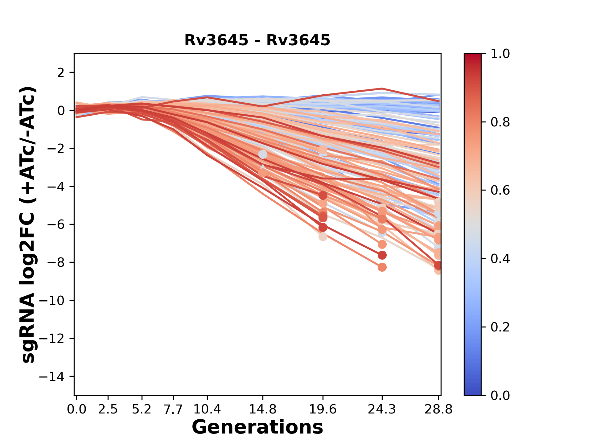 Here, we show sgRNA log2 fold-change values (L2FC) (plus versus minus ATc) over consecutive generations for sgRNAs targeting the gene you selected.