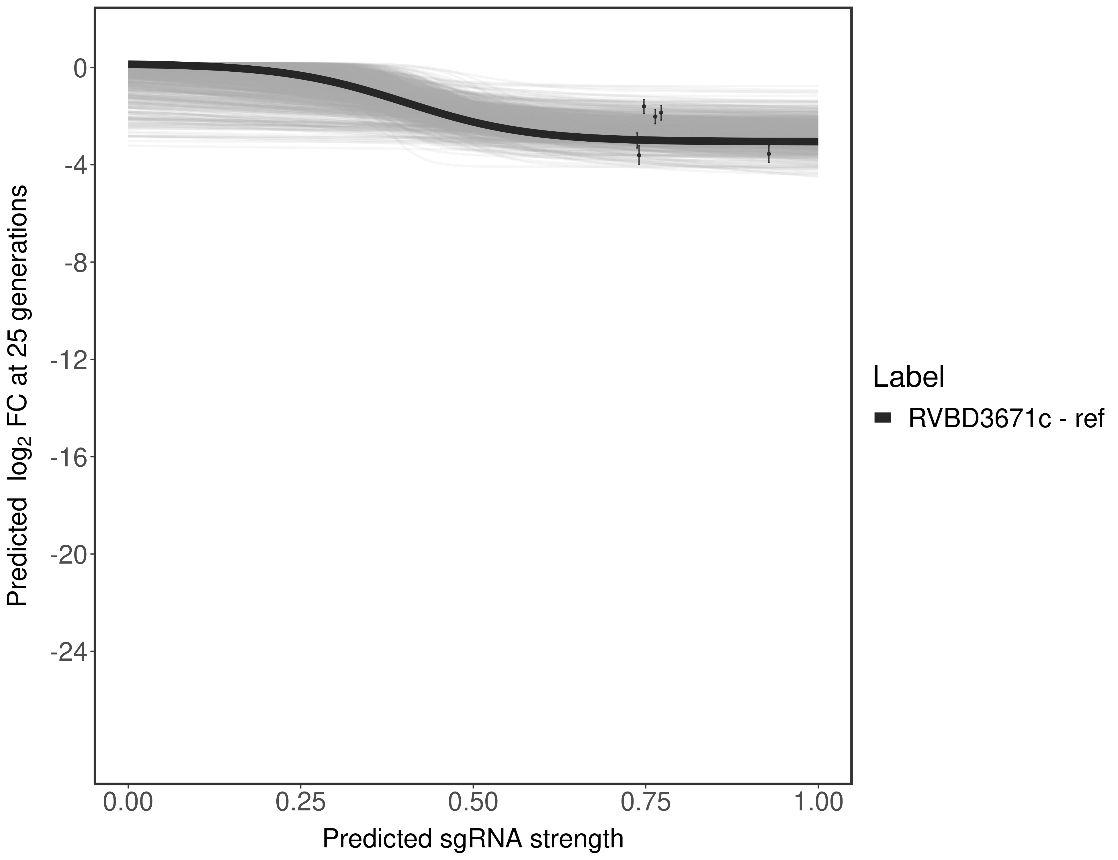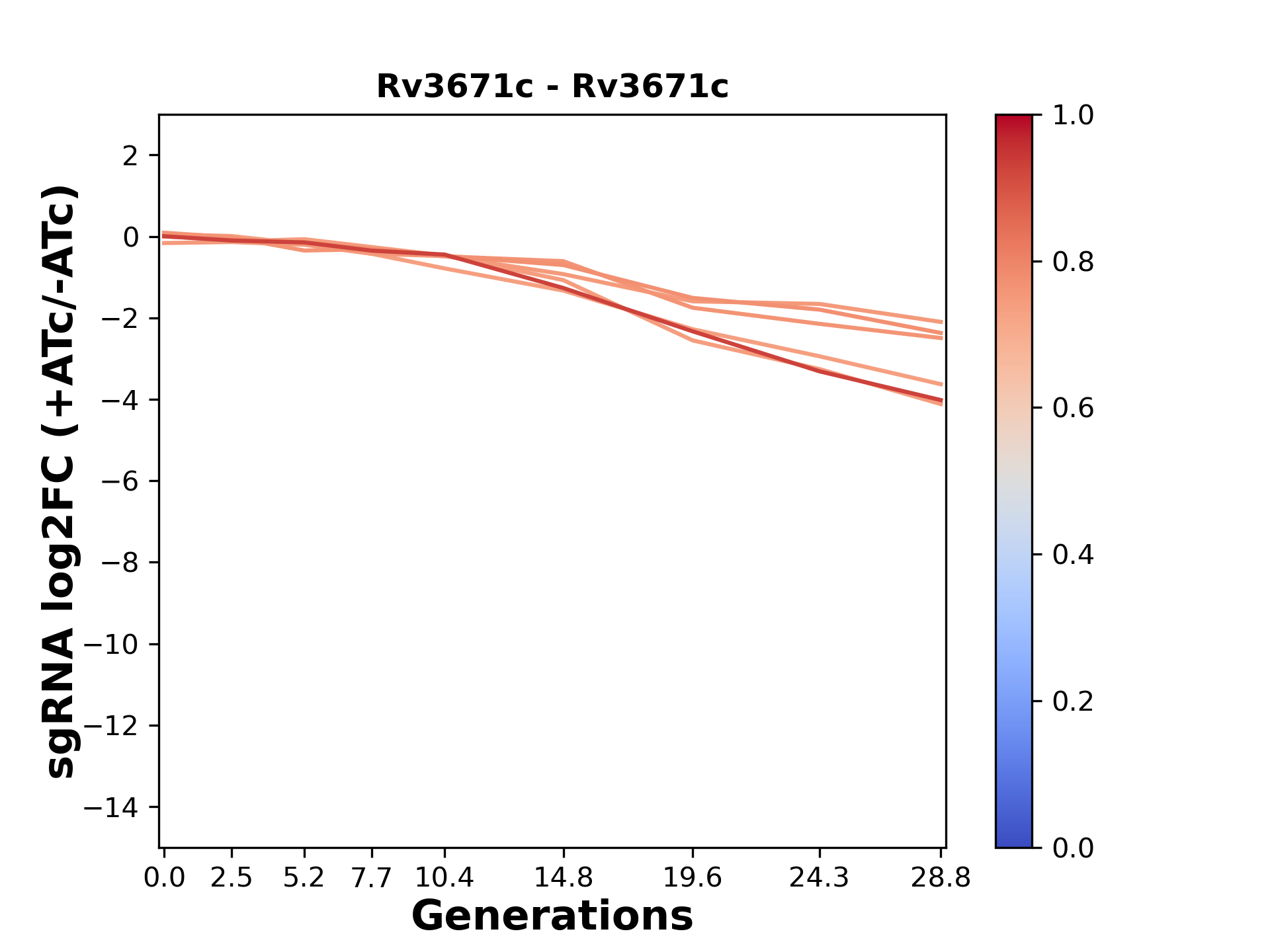 Experiment: We designed an M. tuberculosis CRISPRi library (RLC12) to target all annotated Mtb genes with single guide RNAs (sgRNAs) of varying predicted knockdown efficiencies. In parallel, we constructed a M. smegmatis CRISPRi library (RLC11) to target all annotated Msmeg genes, similar to the Mtb sgRNA library. RLC12 was transformed into M. tuberculosis H37Rv; RLC11 into M. smegmatis mc2-155. We passaged both CRISPRi libraries for nearly 30 generations in the presence or absence of the CRISPRi-inducer anhydrotetracycline (ATc). At the indicated timepoints, genomic DNA was harvested and the representation of individual sgRNAs was counted using Illumina sequencing. Here, we show sgRNA log2 fold-change values (L2FC) (plus versus minus ATc) over consecutive generations for sgRNAs targeting the gene you selected. sgRNAs are color-coded based on their predicted strength from blue (strength=0; weak) to red (strength=1; strong).