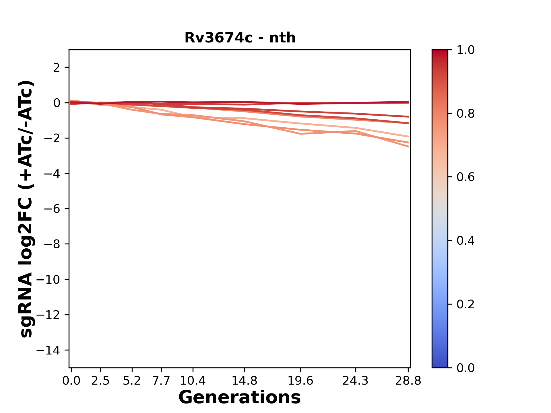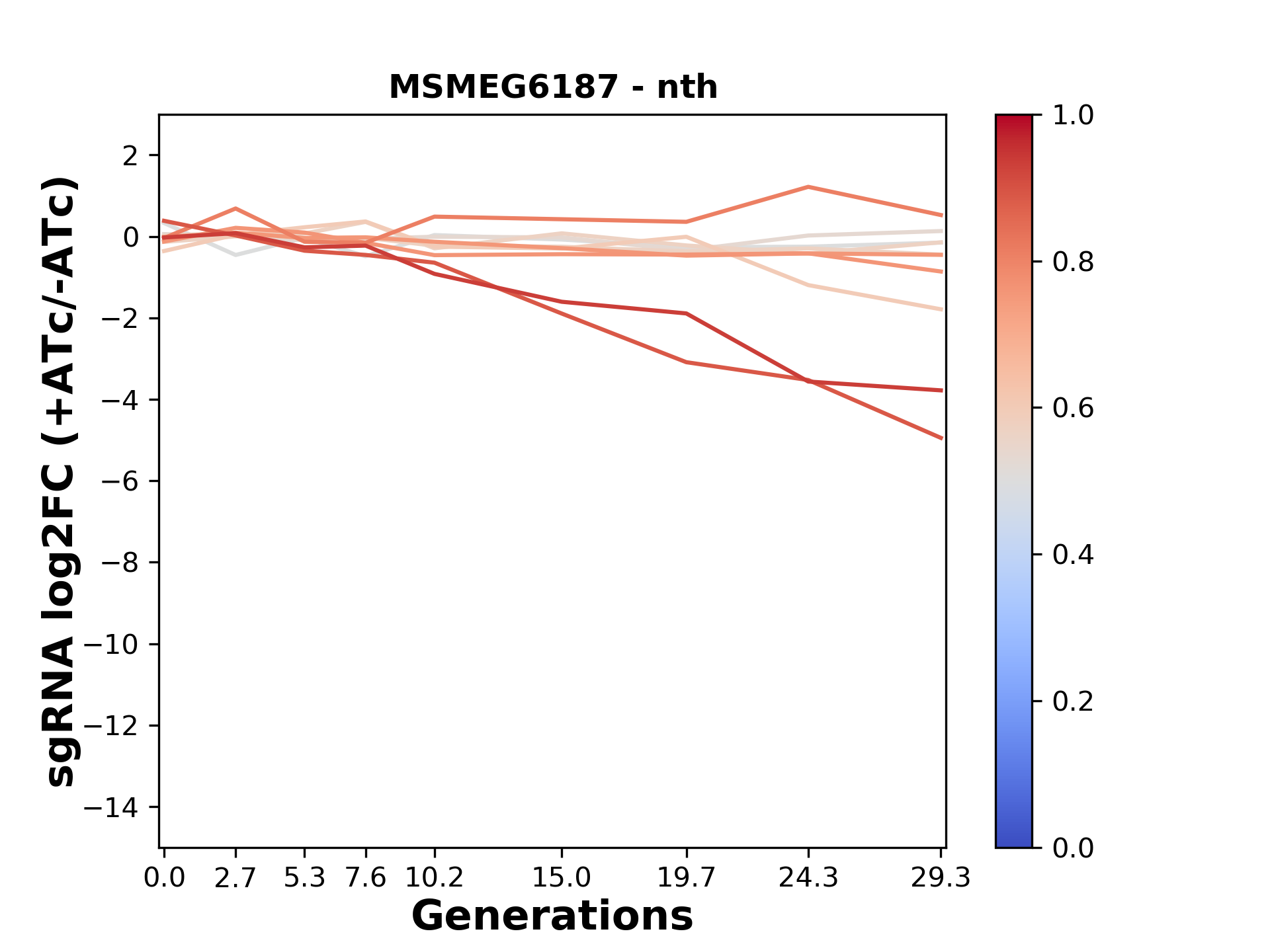 Here, we show sgRNA log2 fold-change values (L2FC) (plus versus minus ATc) over consecutive generations for sgRNAs targeting the gene you selected.