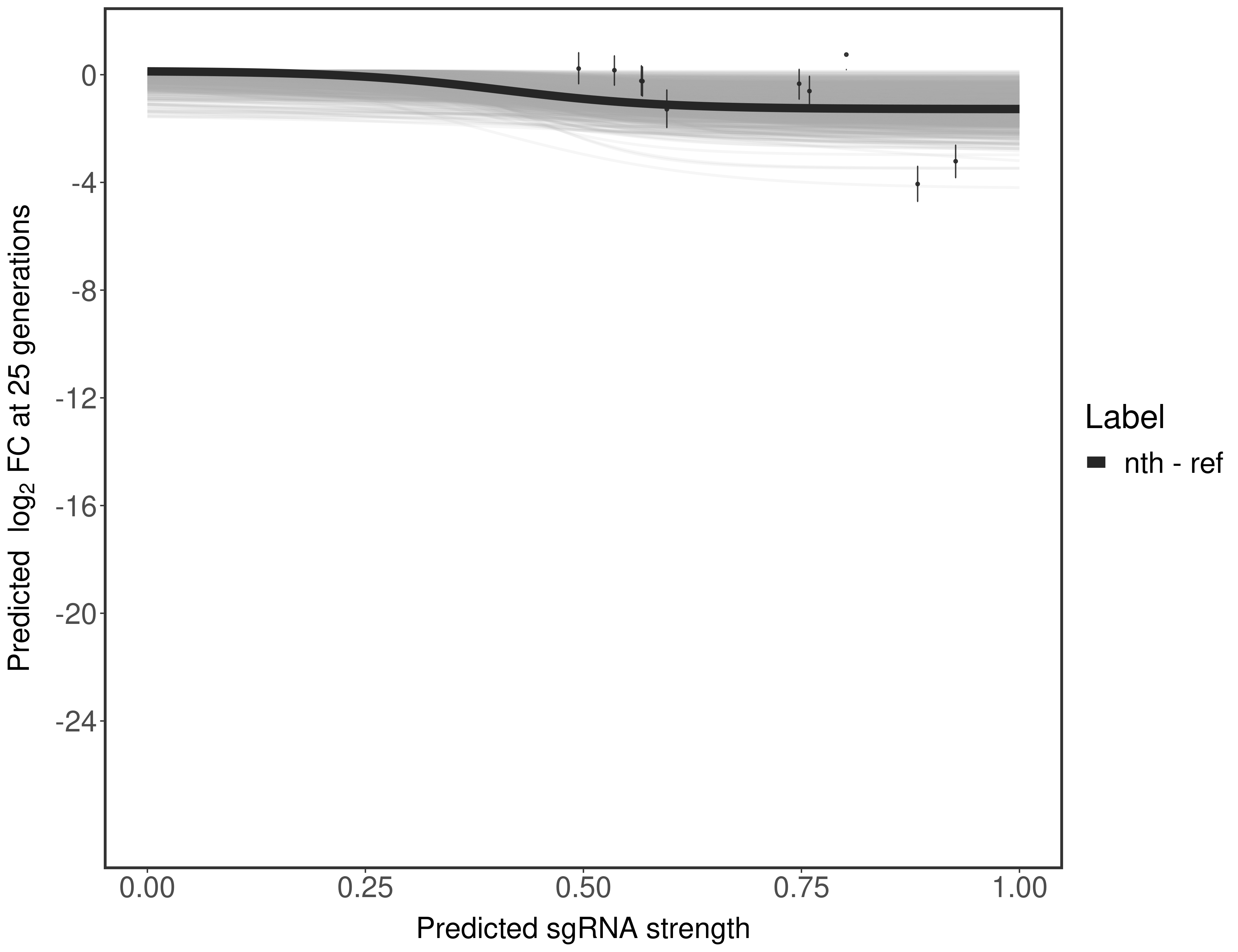 In order to quantify gene vulnerability, data were subsequently analyzed with a hierarchical model at the sgRNA level (two-line model) and gene level (Hill curve). The vulnerability quantification is shown below. [More information]