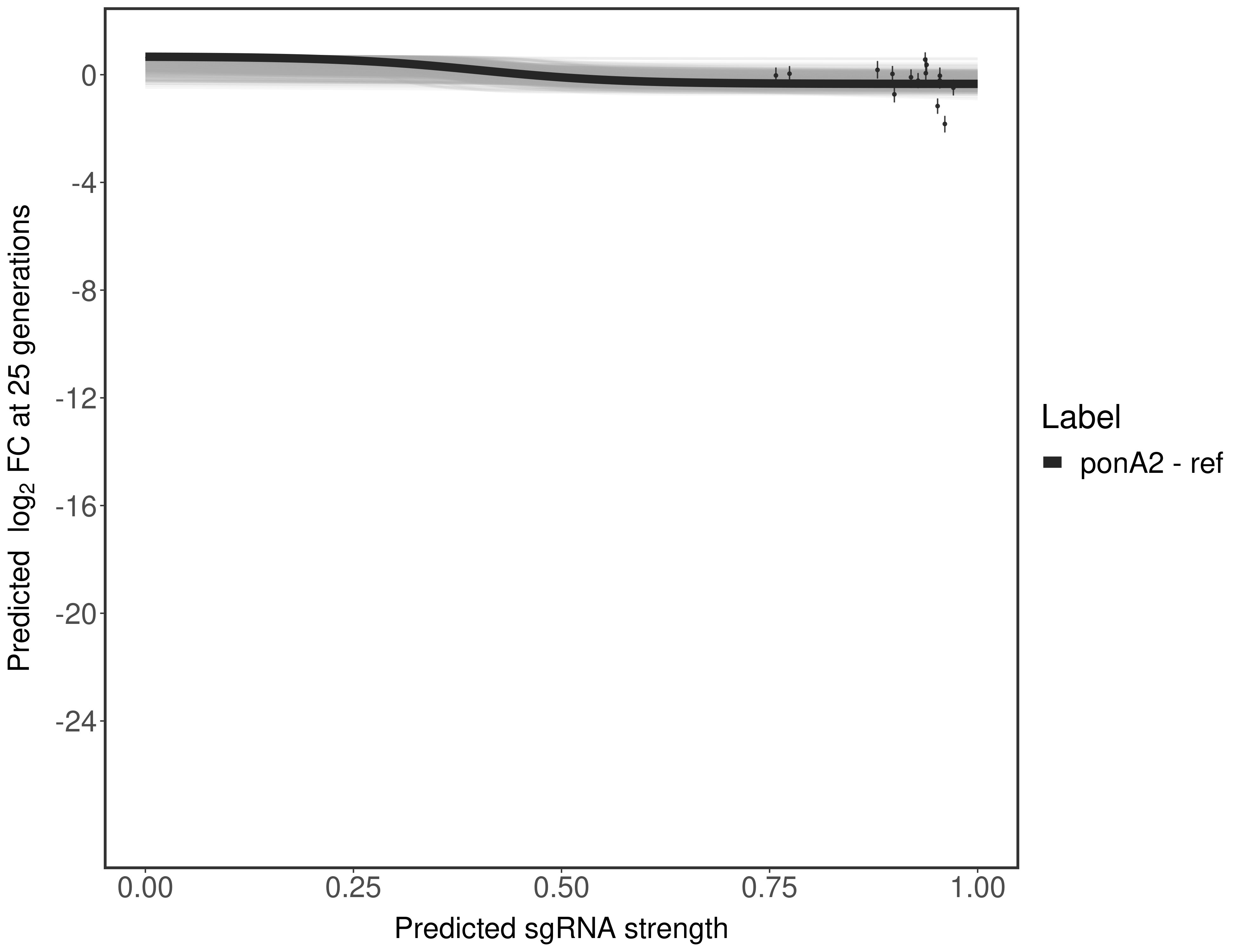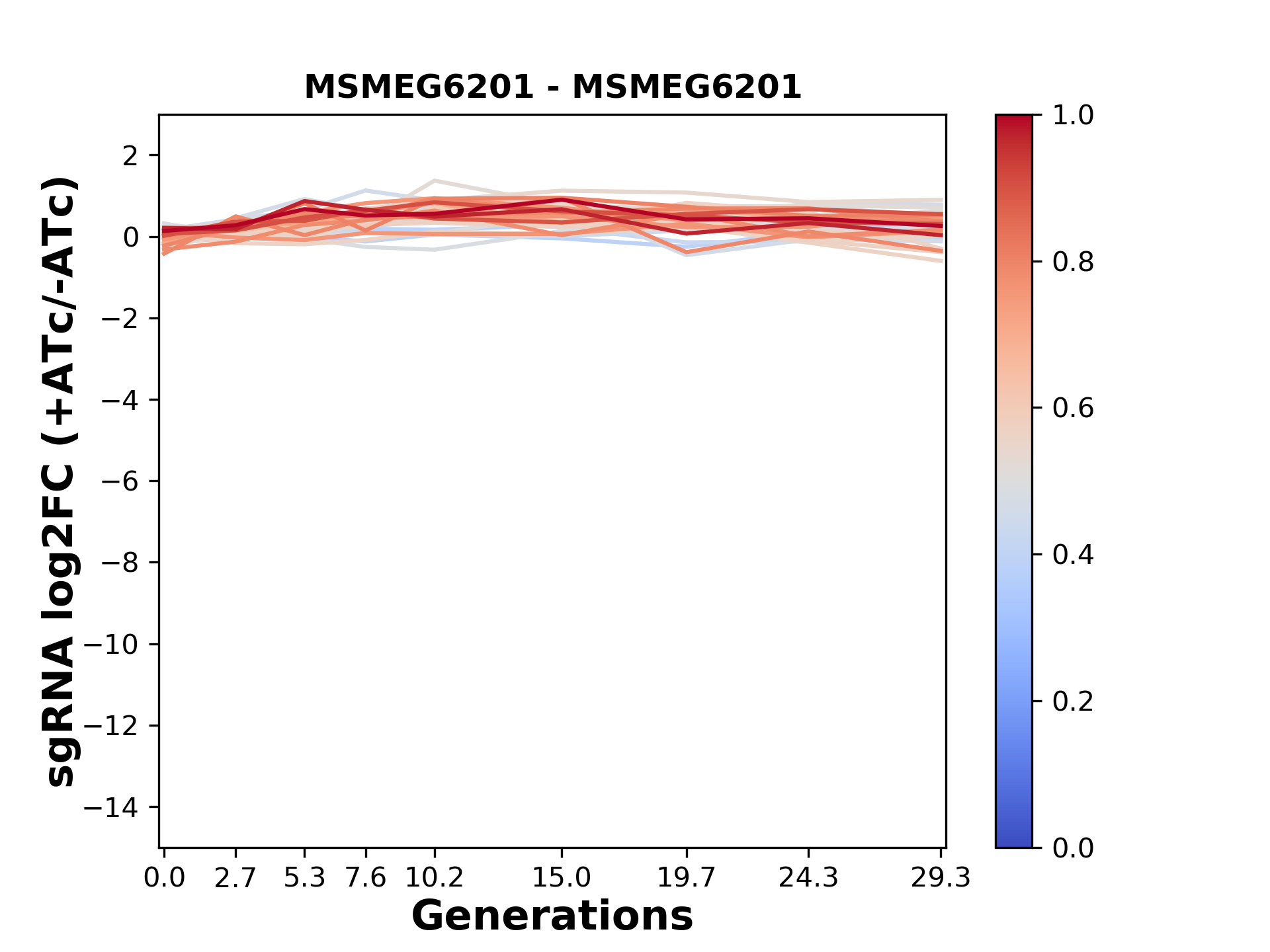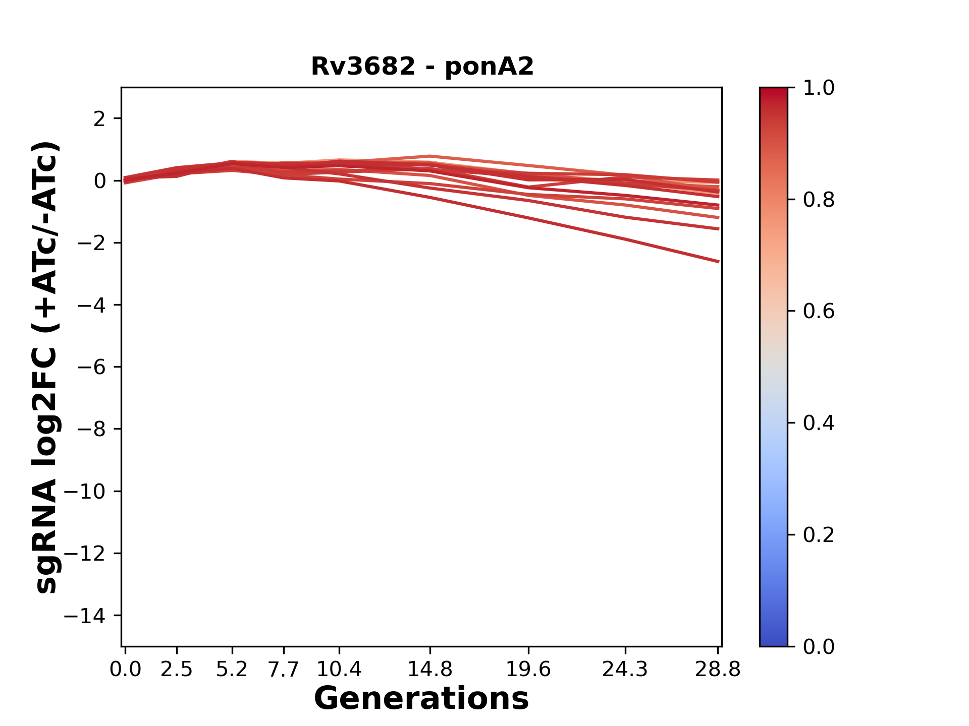 Experiment: We designed an M. tuberculosis CRISPRi library (RLC12) to target all annotated Mtb genes with single guide RNAs (sgRNAs) of varying predicted knockdown efficiencies. In parallel, we constructed a M. smegmatis CRISPRi library (RLC11) to target all annotated Msmeg genes, similar to the Mtb sgRNA library. RLC12 was transformed into M. tuberculosis H37Rv; RLC11 into M. smegmatis mc2-155. We passaged both CRISPRi libraries for nearly 30 generations in the presence or absence of the CRISPRi-inducer anhydrotetracycline (ATc). At the indicated timepoints, genomic DNA was harvested and the representation of individual sgRNAs was counted using Illumina sequencing. Here, we show sgRNA log2 fold-change values (L2FC) (plus versus minus ATc) over consecutive generations for sgRNAs targeting the gene you selected. sgRNAs are color-coded based on their predicted strength from blue (strength=0; weak) to red (strength=1; strong).