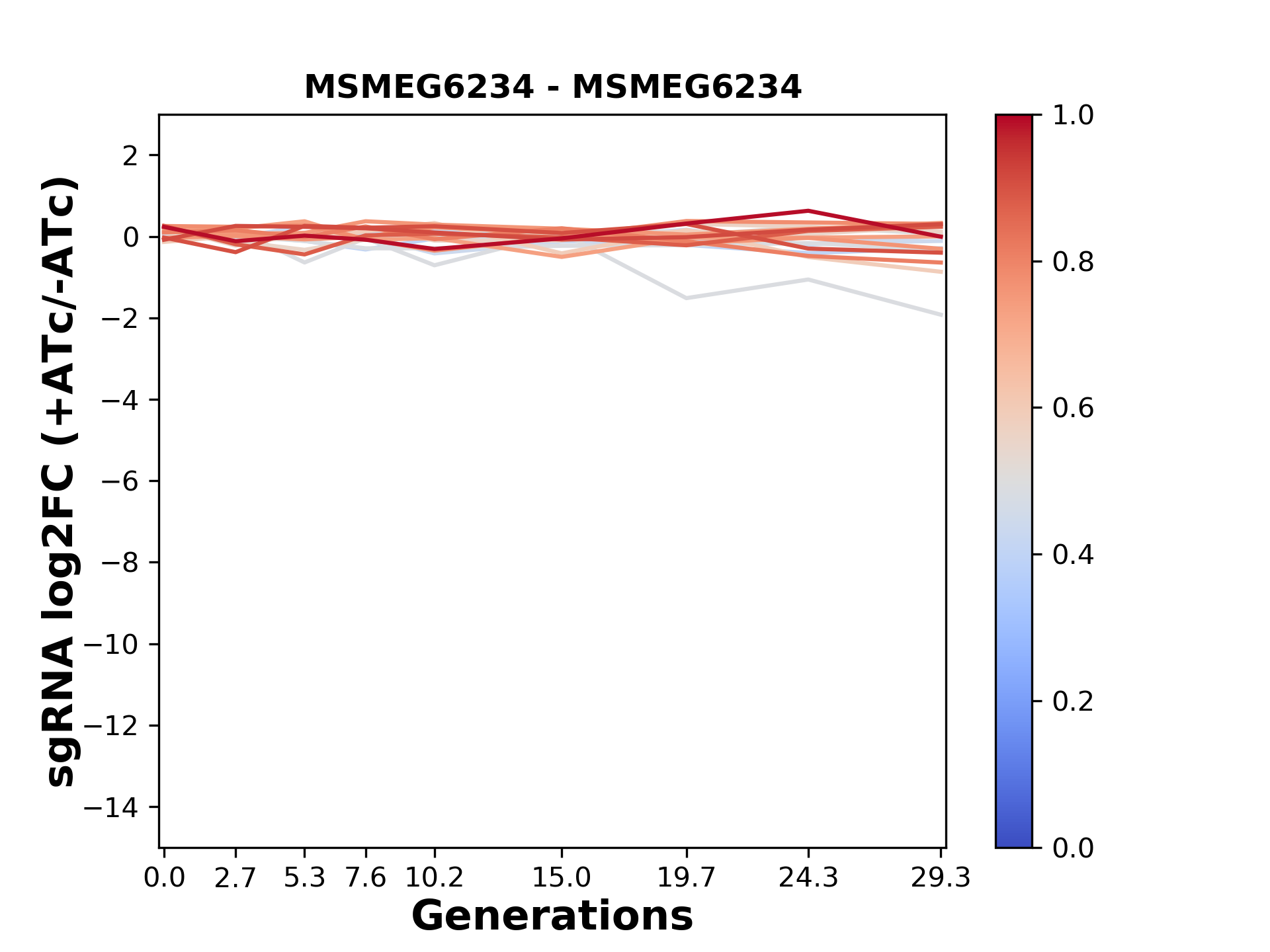 Here, we show sgRNA log2 fold-change values (L2FC) (plus versus minus ATc) over consecutive generations for sgRNAs targeting the gene you selected.