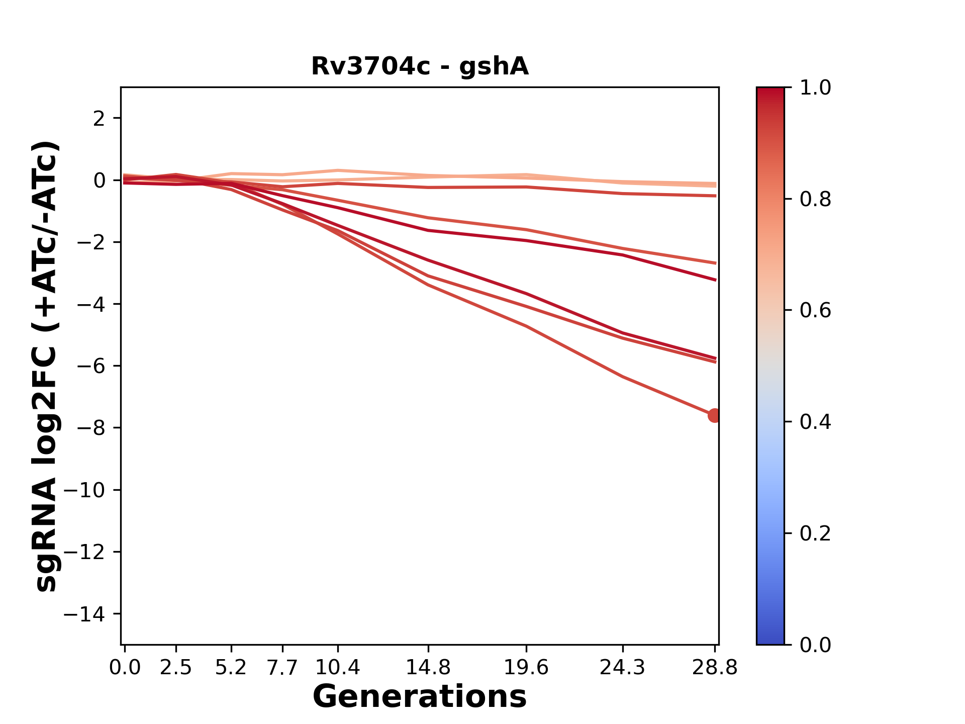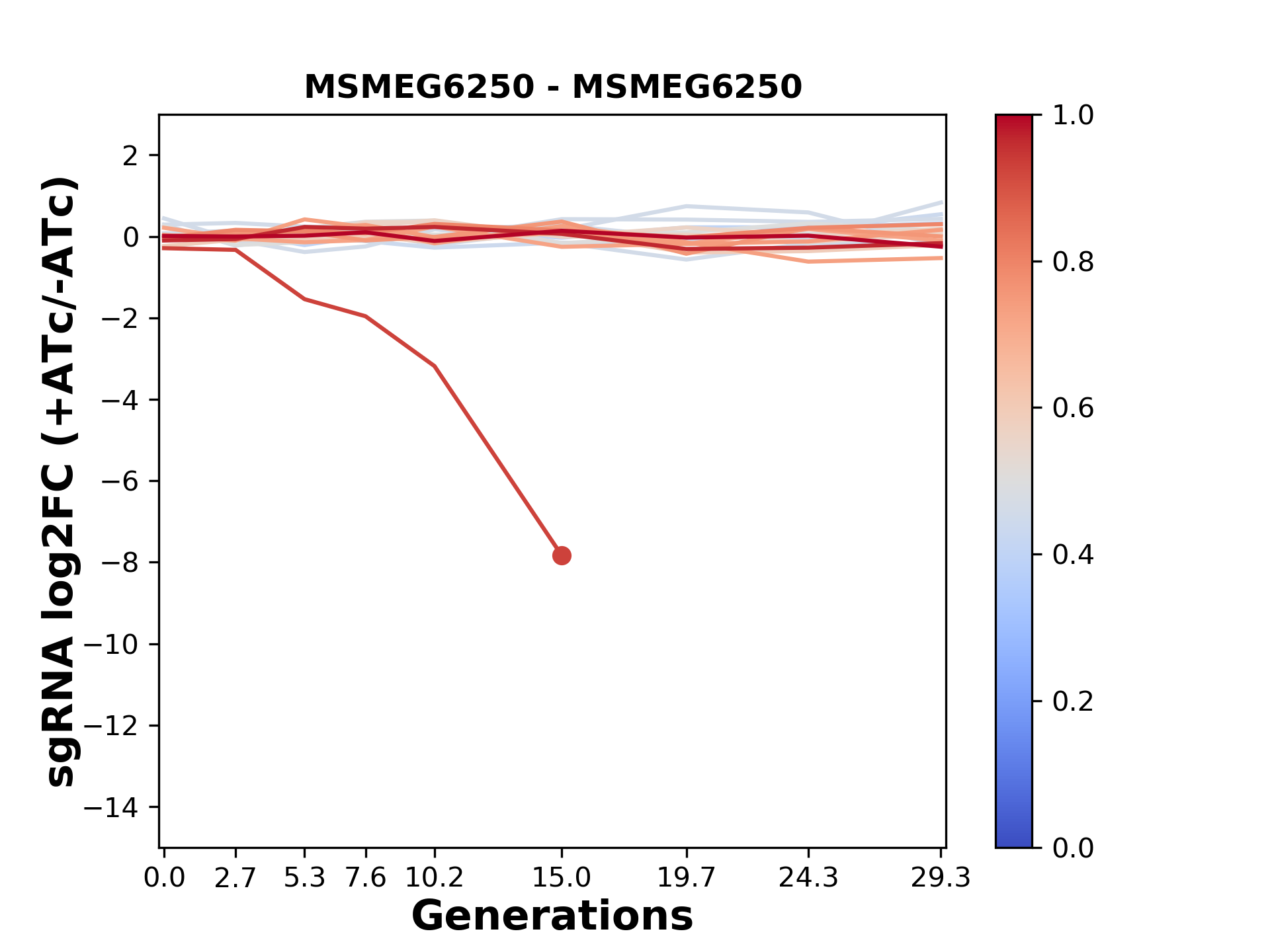Here, we show sgRNA log2 fold-change values (L2FC) (plus versus minus ATc) over consecutive generations for sgRNAs targeting the gene you selected.
