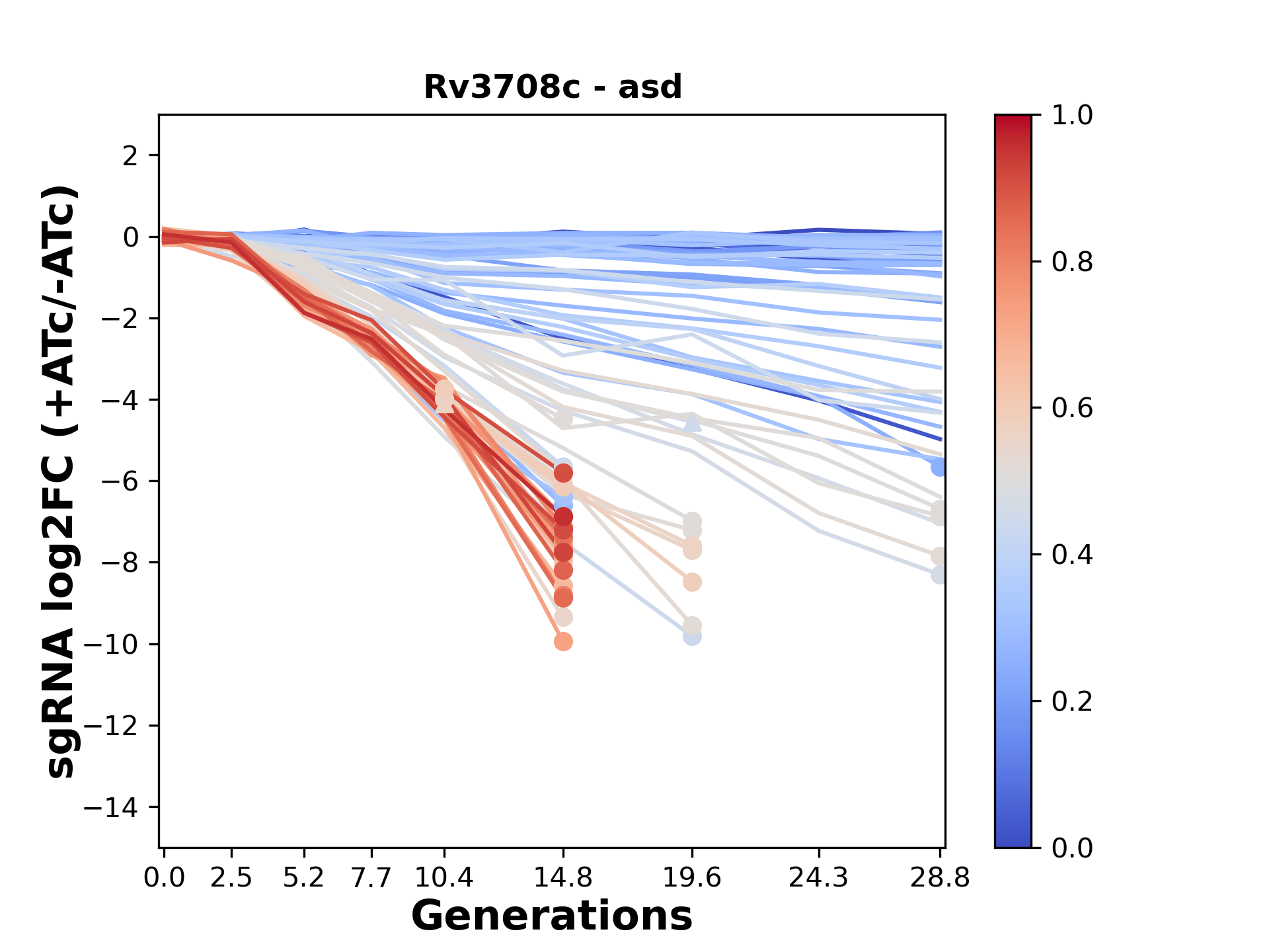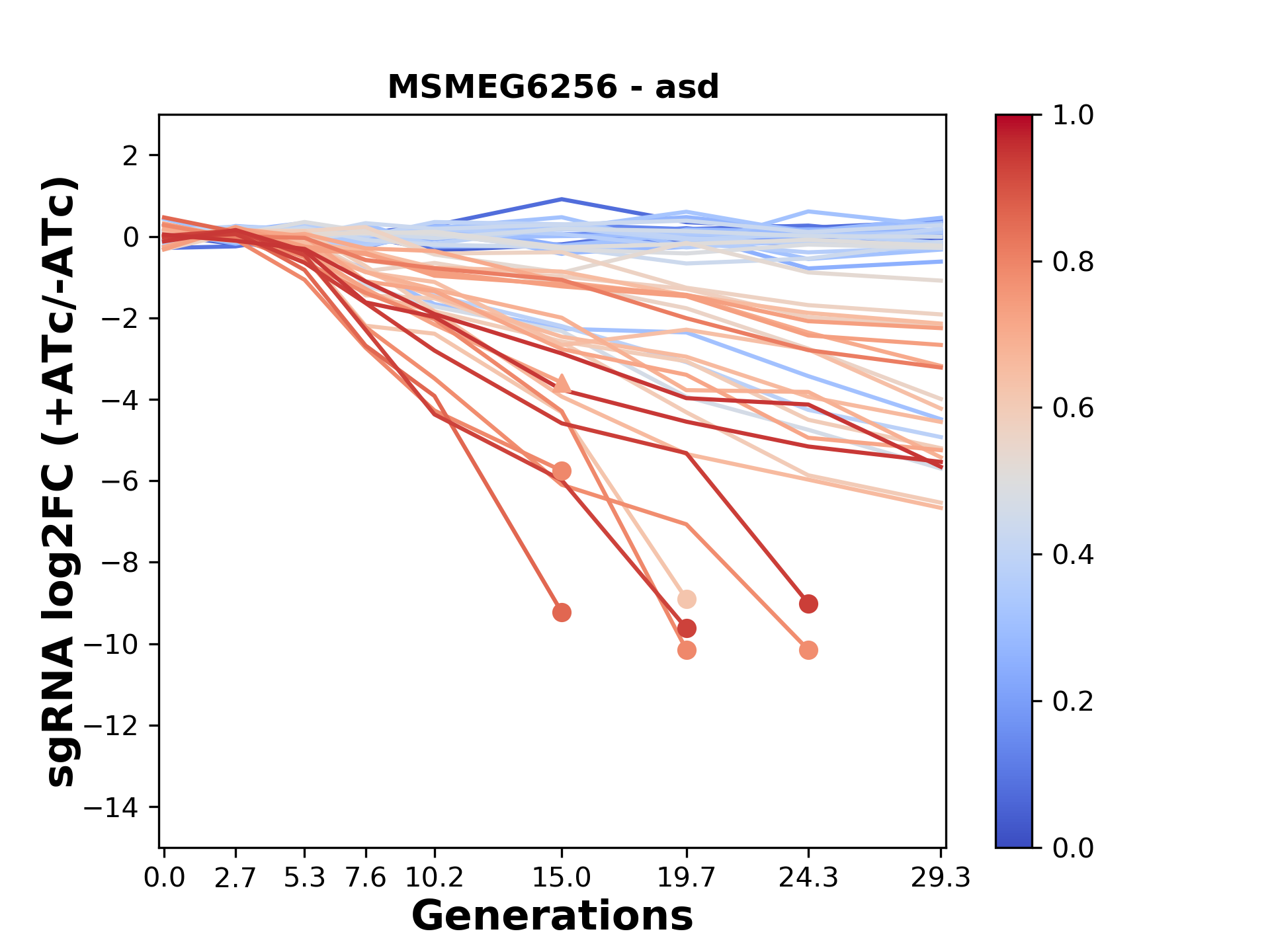 Here, we show sgRNA log2 fold-change values (L2FC) (plus versus minus ATc) over consecutive generations for sgRNAs targeting the gene you selected.