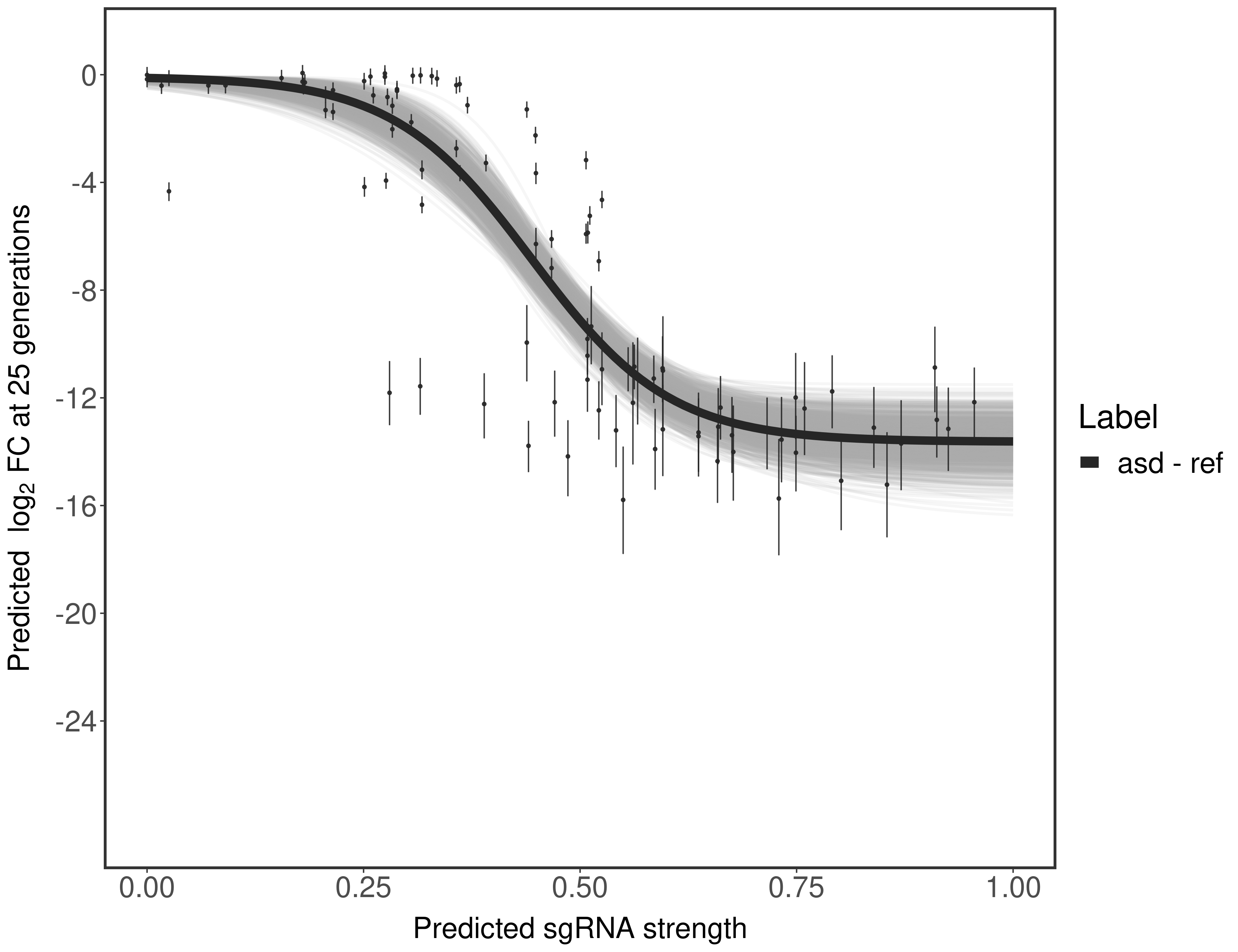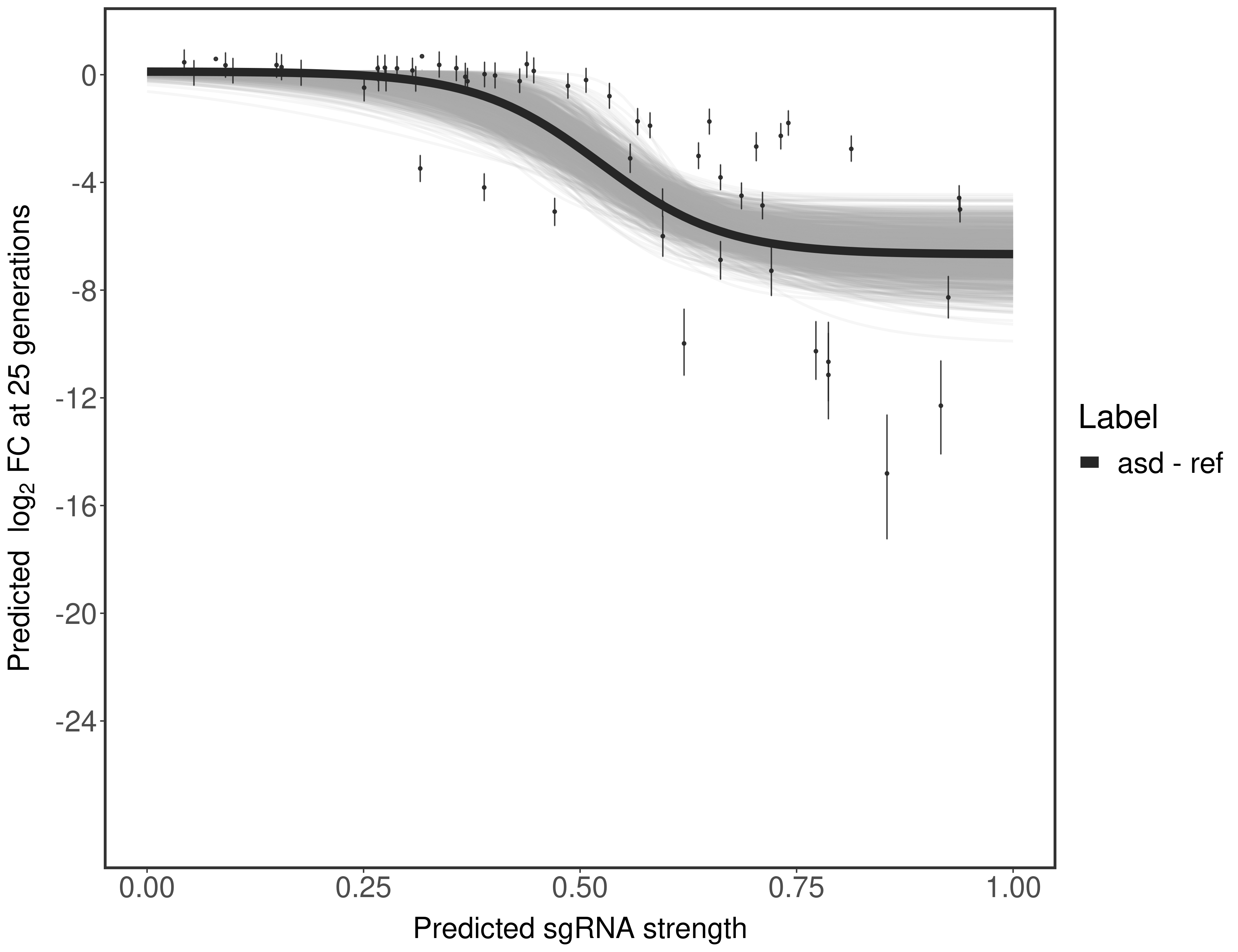 In order to quantify gene vulnerability, data were subsequently analyzed with a hierarchical model at the sgRNA level (two-line model) and gene level (Hill curve). The vulnerability quantification is shown below. [More information]