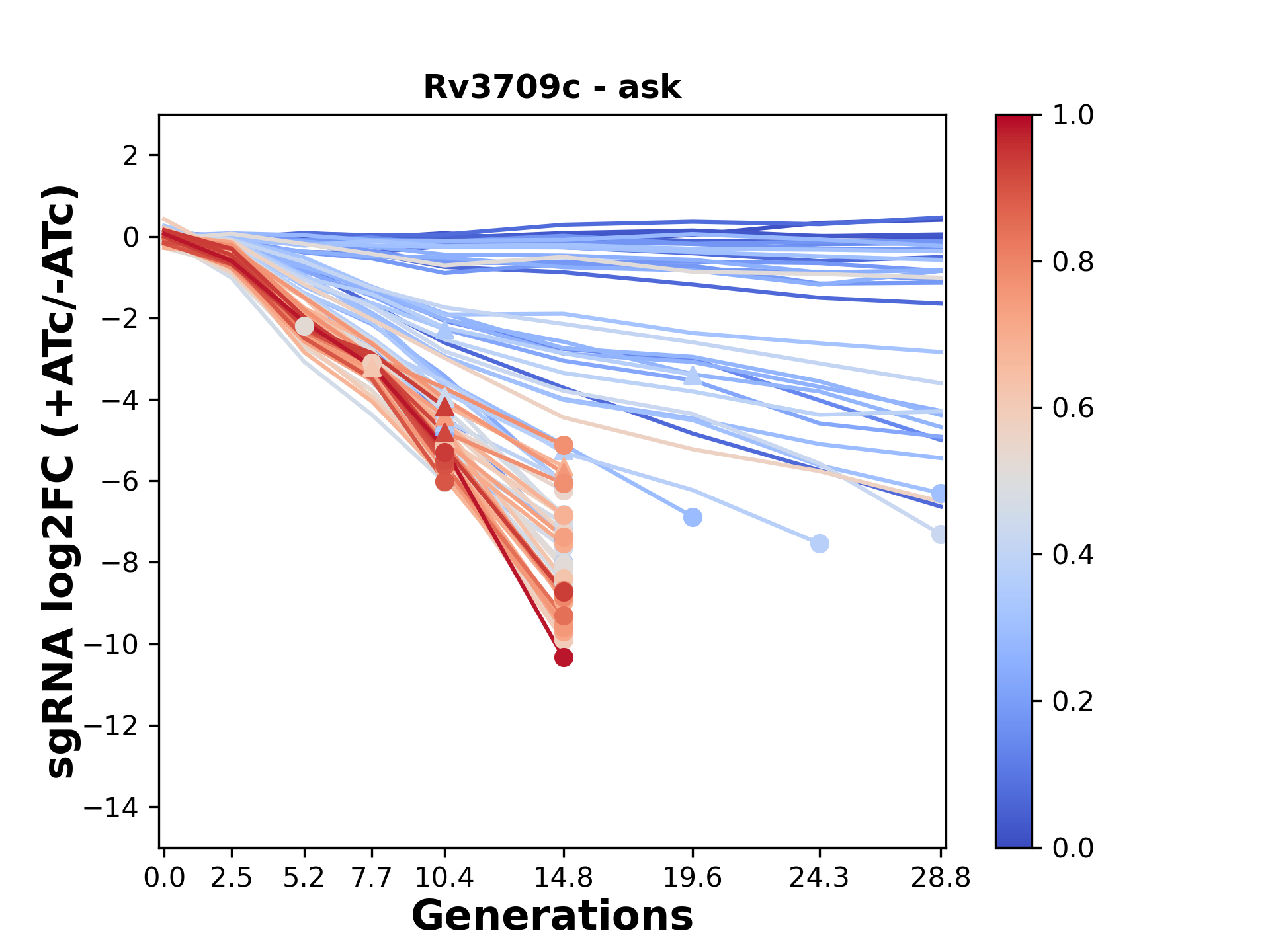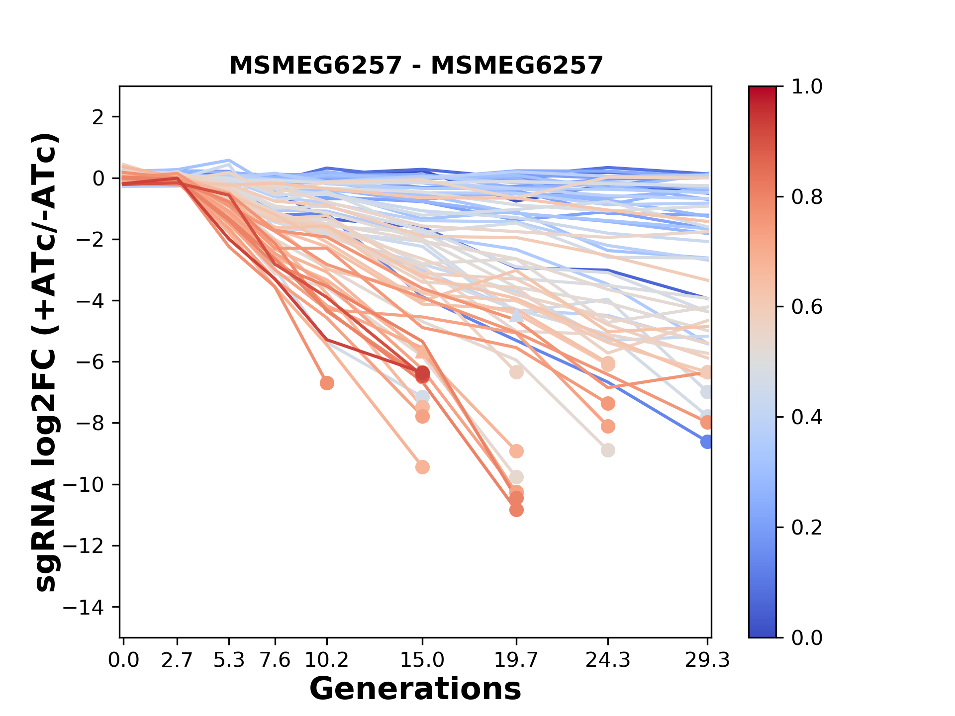 Here, we show sgRNA log2 fold-change values (L2FC) (plus versus minus ATc) over consecutive generations for sgRNAs targeting the gene you selected.