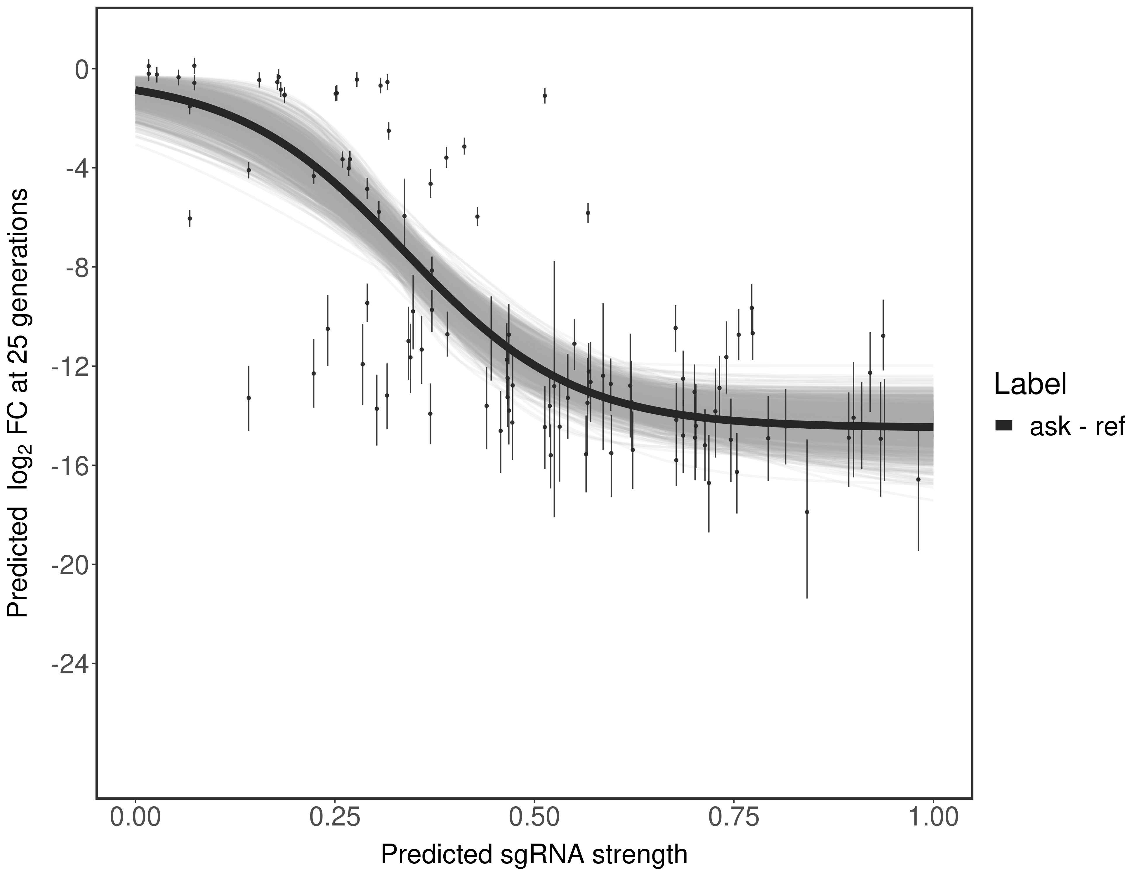 In order to quantify gene vulnerability, data were subsequently analyzed with a hierarchical model at the sgRNA level (two-line model) and gene level (Hill curve). The vulnerability quantification is shown below. [More information]