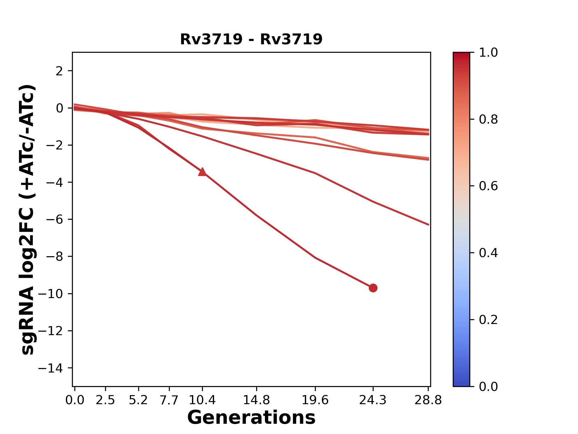 Here, we show sgRNA log2 fold-change values (L2FC) (plus versus minus ATc) over consecutive generations for sgRNAs targeting the gene you selected.