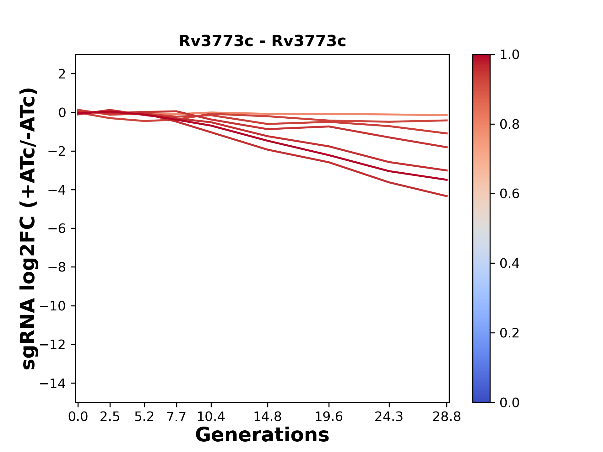 Here, we show sgRNA log2 fold-change values (L2FC) (plus versus minus ATc) over consecutive generations for sgRNAs targeting the gene you selected.