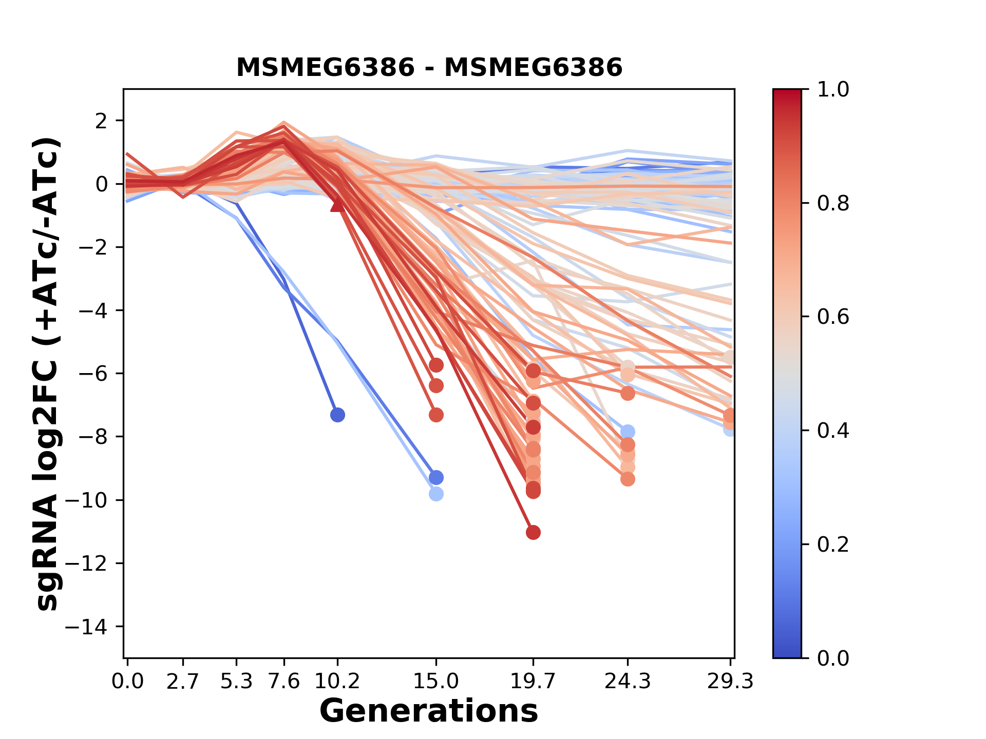 Here, we show sgRNA log2 fold-change values (L2FC) (plus versus minus ATc) over consecutive generations for sgRNAs targeting the gene you selected.
