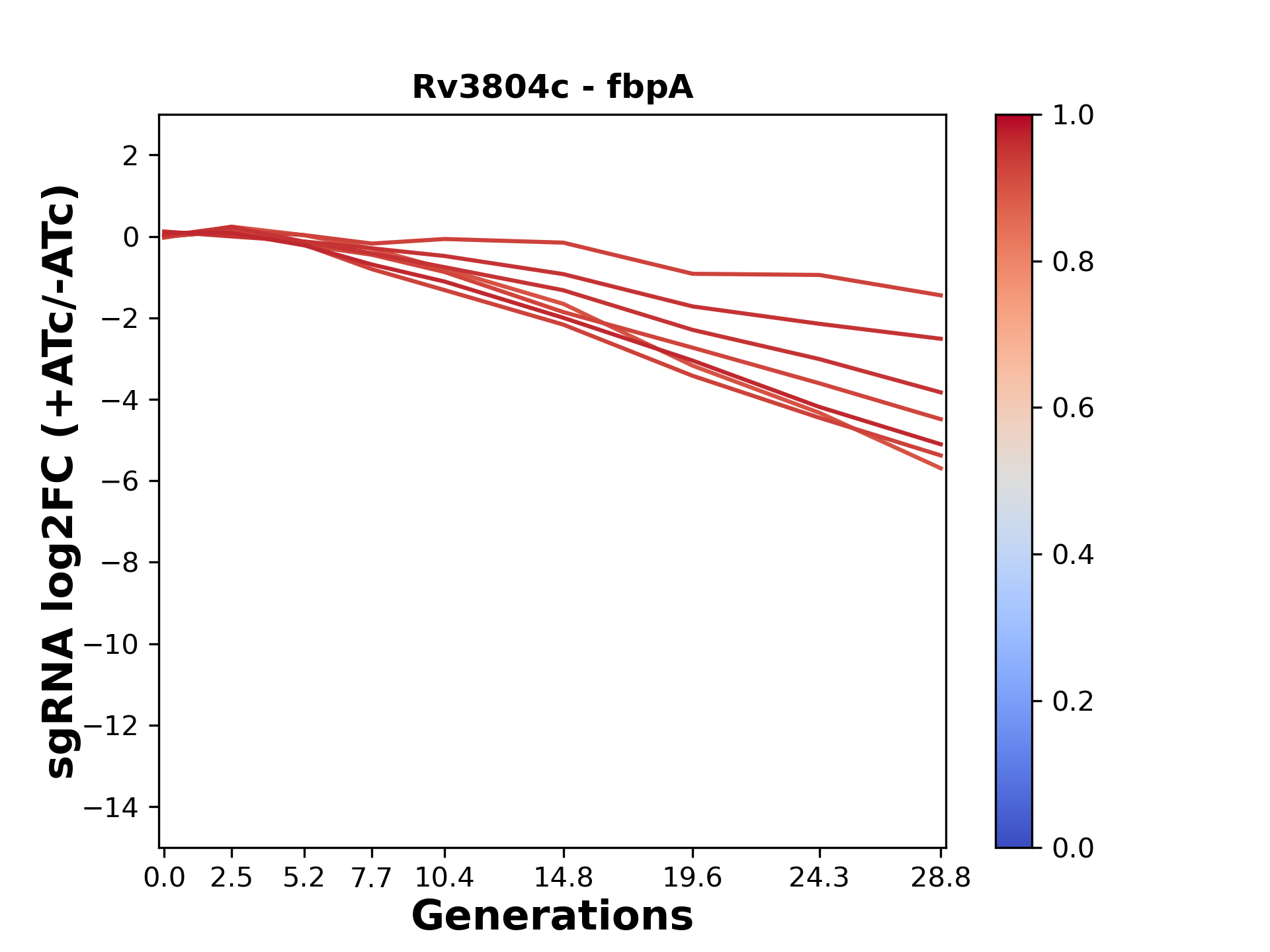 Here, we show sgRNA log2 fold-change values (L2FC) (plus versus minus ATc) over consecutive generations for sgRNAs targeting the gene you selected.