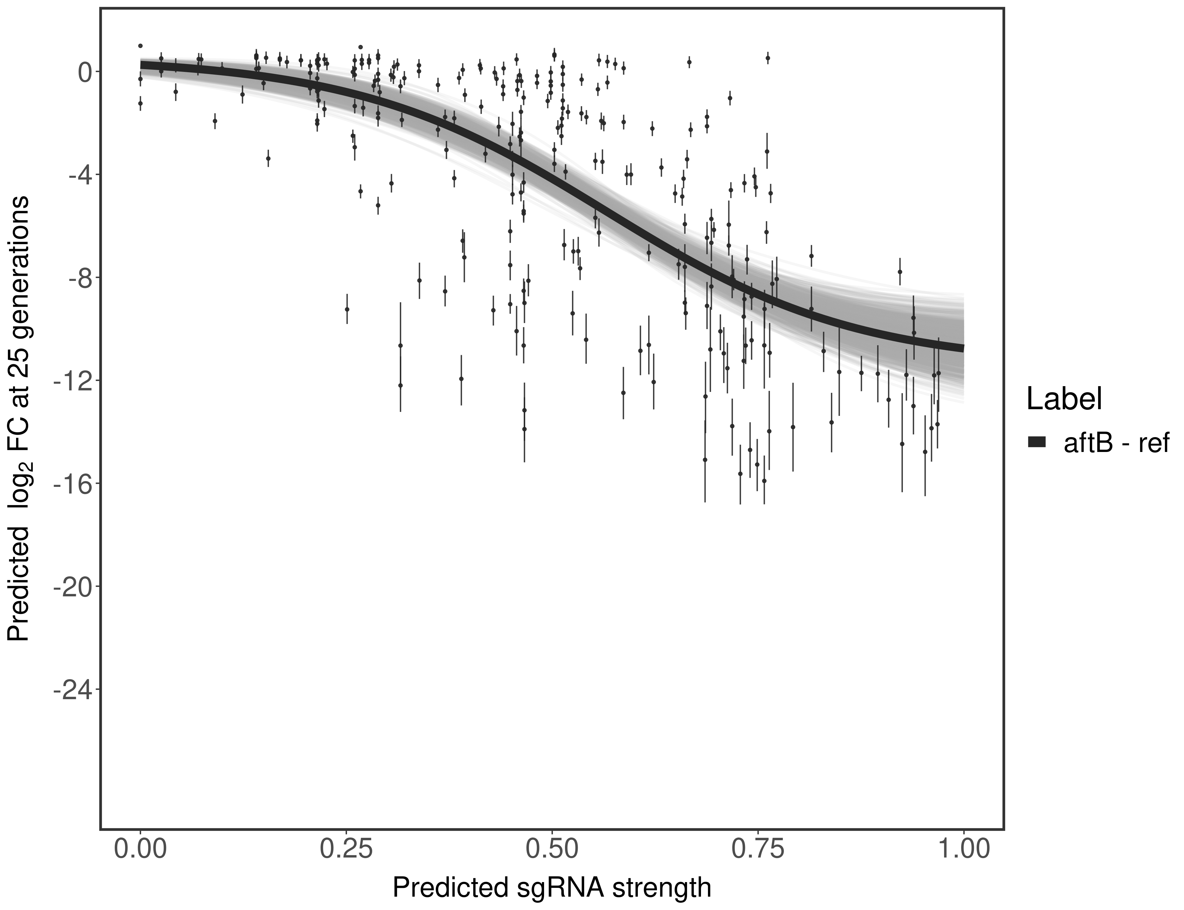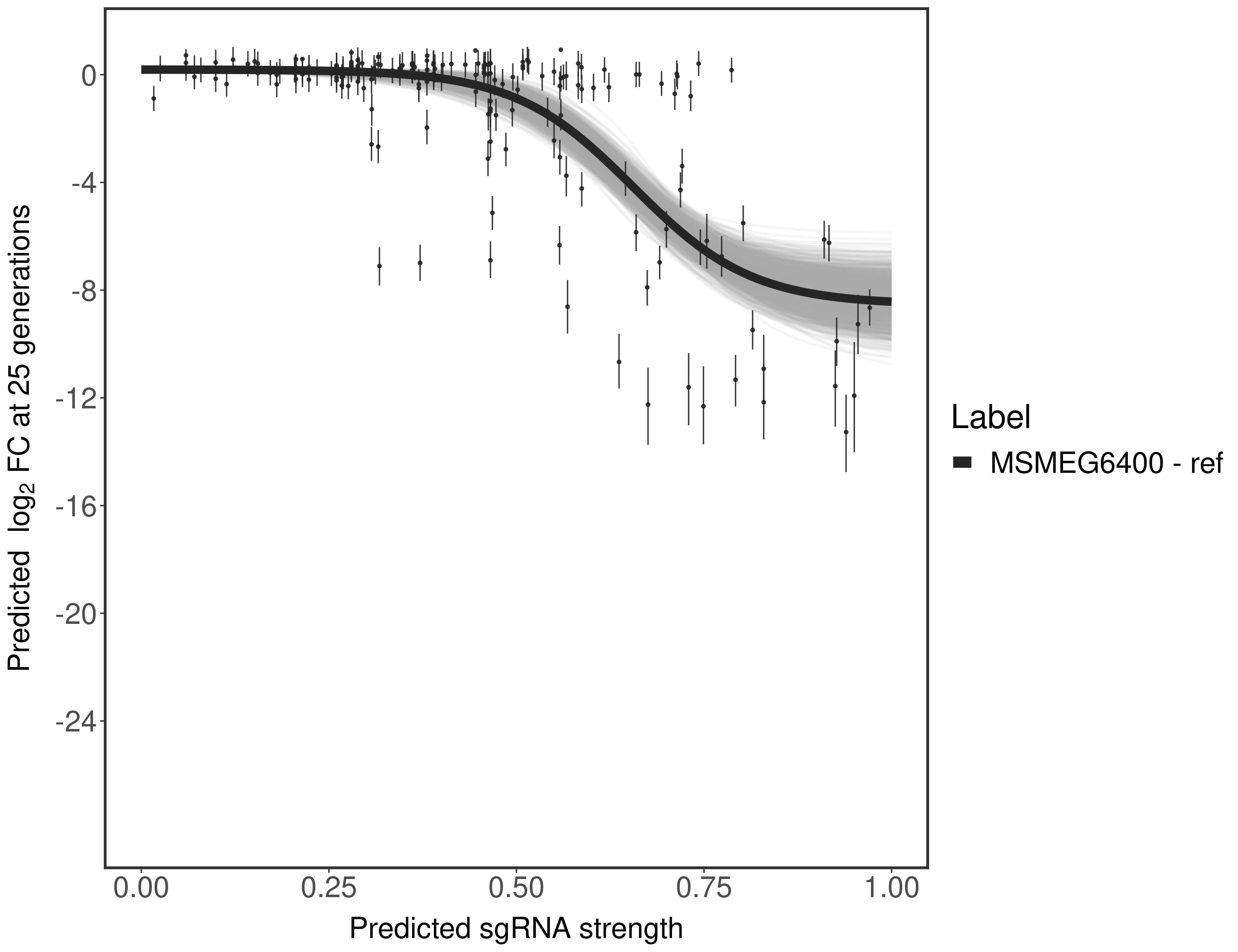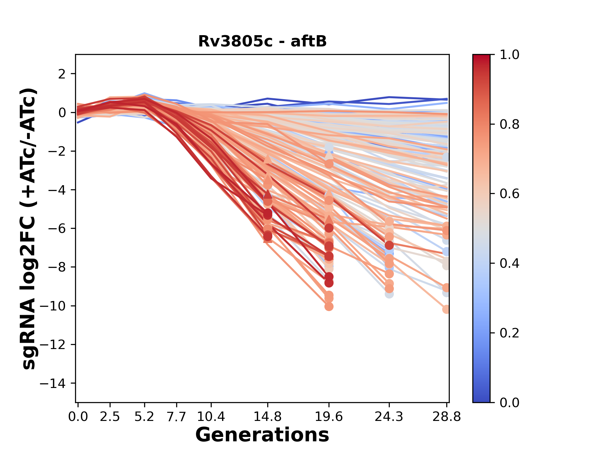 Experiment: We designed an M. tuberculosis CRISPRi library (RLC12) to target all annotated Mtb genes with single guide RNAs (sgRNAs) of varying predicted knockdown efficiencies. In parallel, we constructed a M. smegmatis CRISPRi library (RLC11) to target all annotated Msmeg genes, similar to the Mtb sgRNA library. RLC12 was transformed into M. tuberculosis H37Rv; RLC11 into M. smegmatis mc2-155. We passaged both CRISPRi libraries for nearly 30 generations in the presence or absence of the CRISPRi-inducer anhydrotetracycline (ATc). At the indicated timepoints, genomic DNA was harvested and the representation of individual sgRNAs was counted using Illumina sequencing. Here, we show sgRNA log2 fold-change values (L2FC) (plus versus minus ATc) over consecutive generations for sgRNAs targeting the gene you selected. sgRNAs are color-coded based on their predicted strength from blue (strength=0; weak) to red (strength=1; strong).