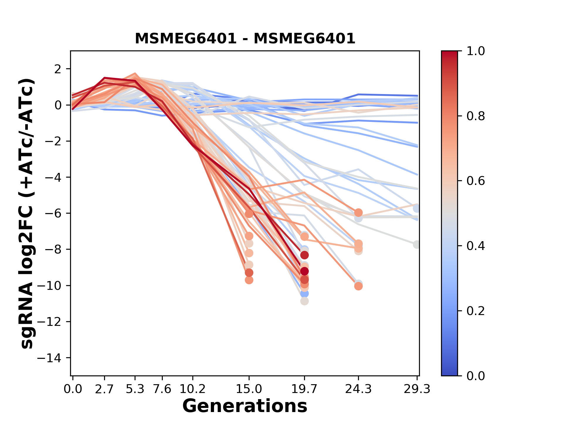Here, we show sgRNA log2 fold-change values (L2FC) (plus versus minus ATc) over consecutive generations for sgRNAs targeting the gene you selected.