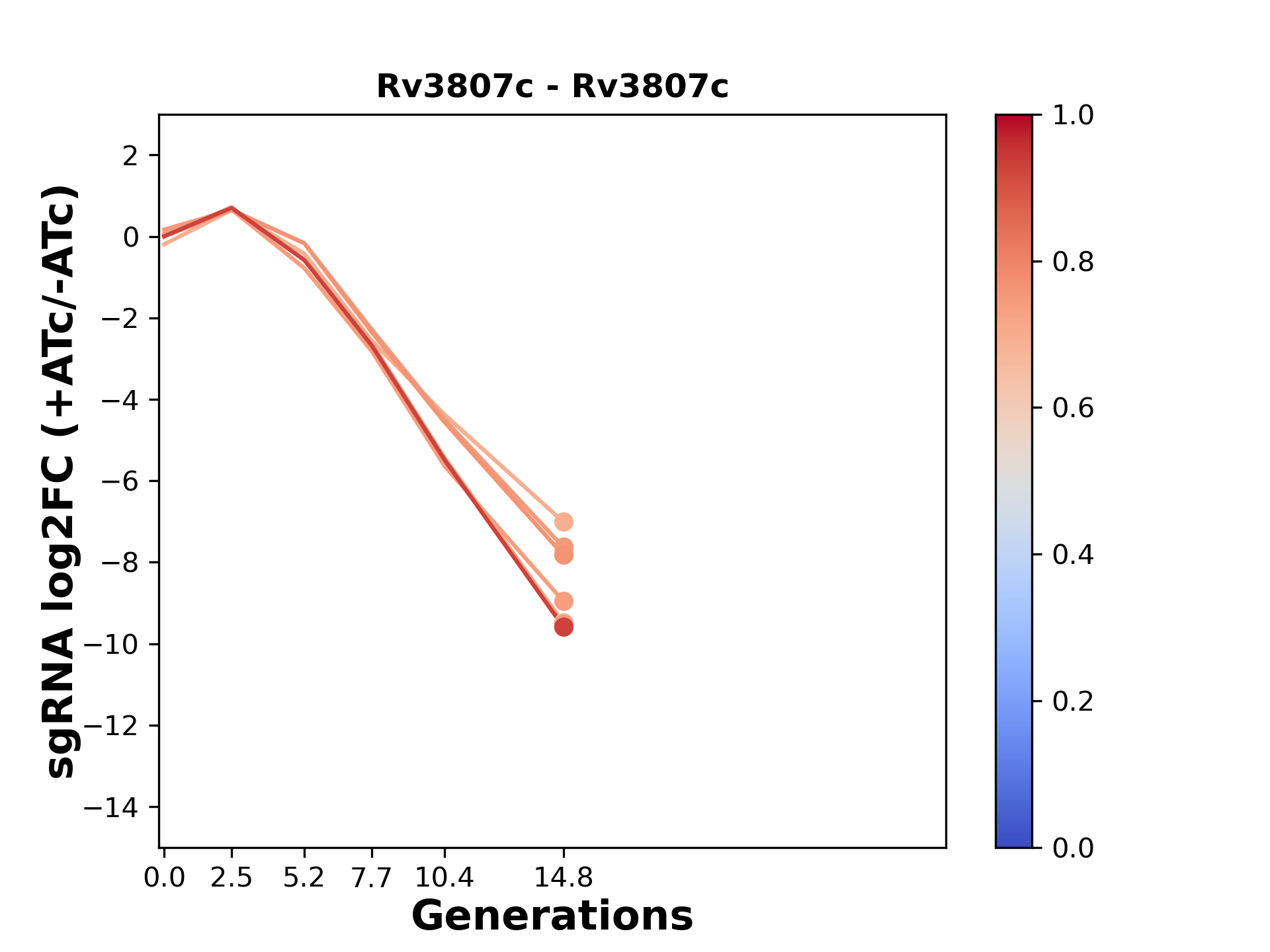 Here, we show sgRNA log2 fold-change values (L2FC) (plus versus minus ATc) over consecutive generations for sgRNAs targeting the gene you selected.