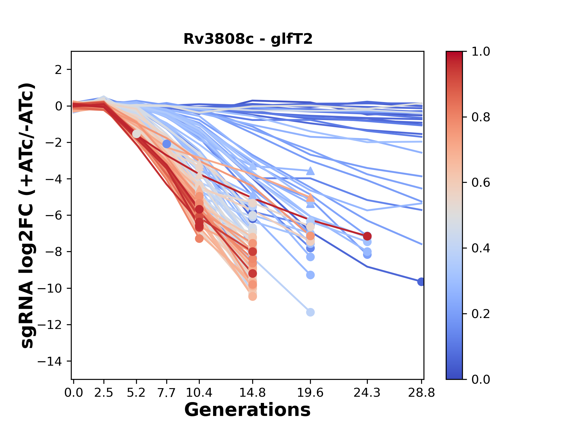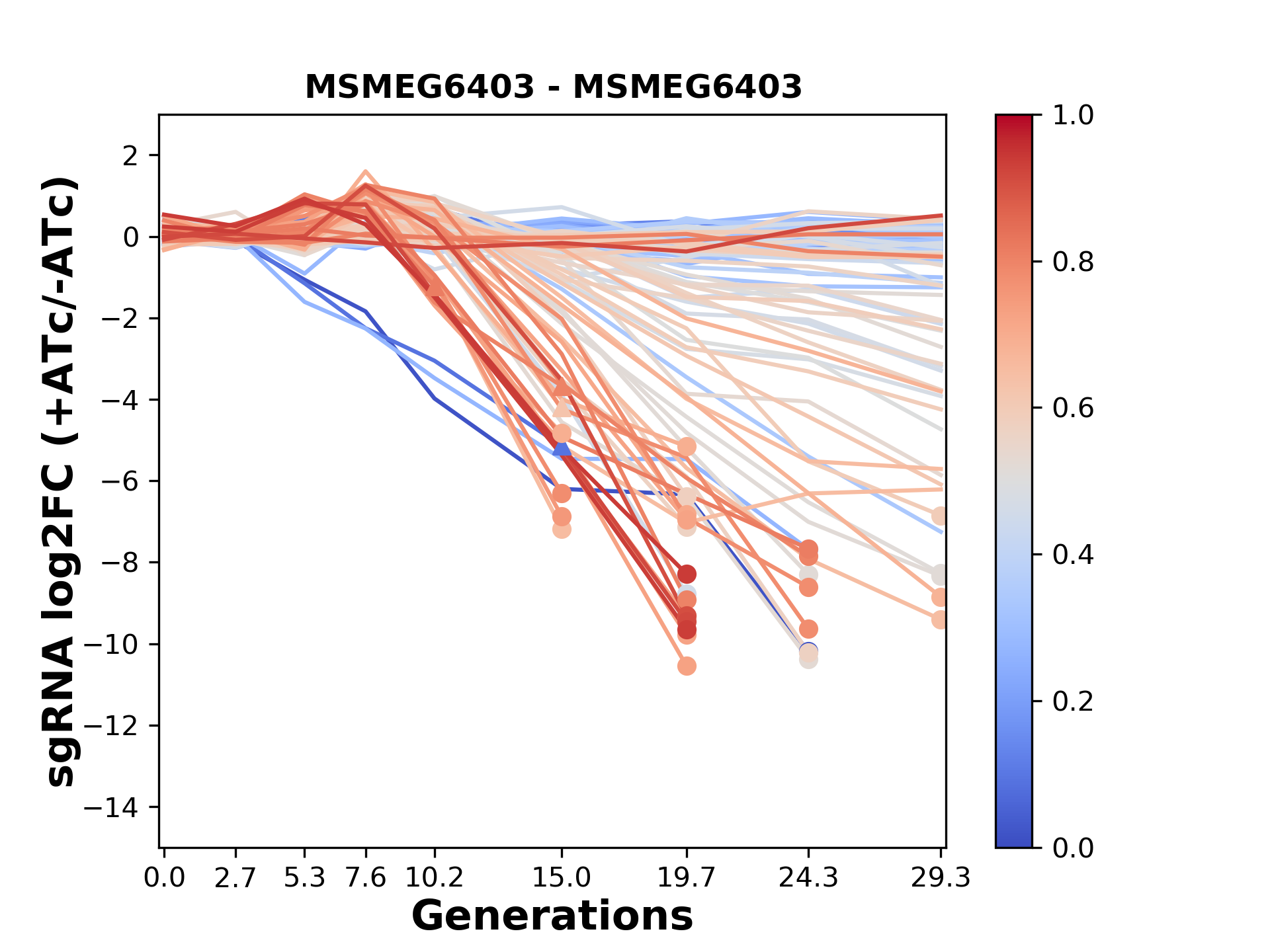 Here, we show sgRNA log2 fold-change values (L2FC) (plus versus minus ATc) over consecutive generations for sgRNAs targeting the gene you selected.