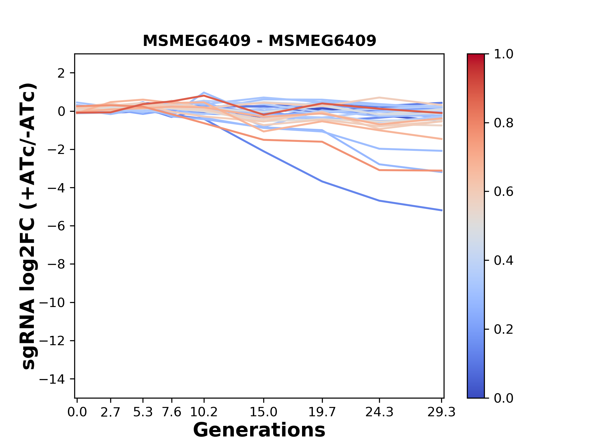 Here, we show sgRNA log2 fold-change values (L2FC) (plus versus minus ATc) over consecutive generations for sgRNAs targeting the gene you selected.