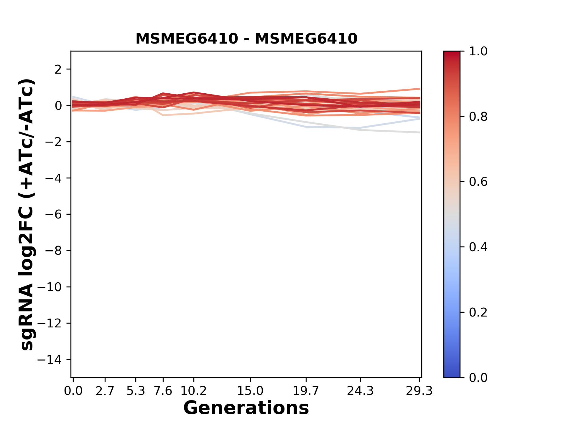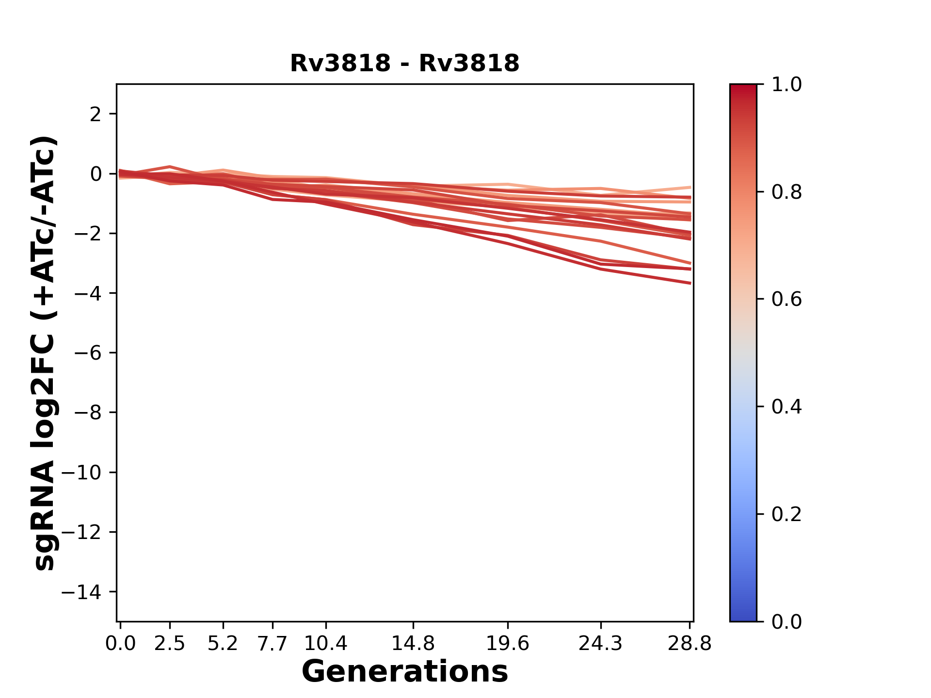Experiment: We designed an M. tuberculosis CRISPRi library (RLC12) to target all annotated Mtb genes with single guide RNAs (sgRNAs) of varying predicted knockdown efficiencies. In parallel, we constructed a M. smegmatis CRISPRi library (RLC11) to target all annotated Msmeg genes, similar to the Mtb sgRNA library. RLC12 was transformed into M. tuberculosis H37Rv; RLC11 into M. smegmatis mc2-155. We passaged both CRISPRi libraries for nearly 30 generations in the presence or absence of the CRISPRi-inducer anhydrotetracycline (ATc). At the indicated timepoints, genomic DNA was harvested and the representation of individual sgRNAs was counted using Illumina sequencing. Here, we show sgRNA log2 fold-change values (L2FC) (plus versus minus ATc) over consecutive generations for sgRNAs targeting the gene you selected. sgRNAs are color-coded based on their predicted strength from blue (strength=0; weak) to red (strength=1; strong).