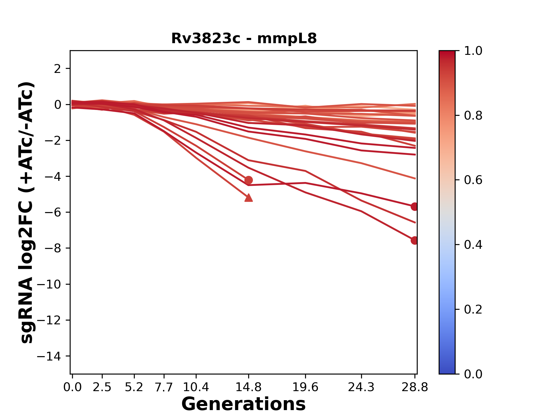 Here, we show sgRNA log2 fold-change values (L2FC) (plus versus minus ATc) over consecutive generations for sgRNAs targeting the gene you selected.