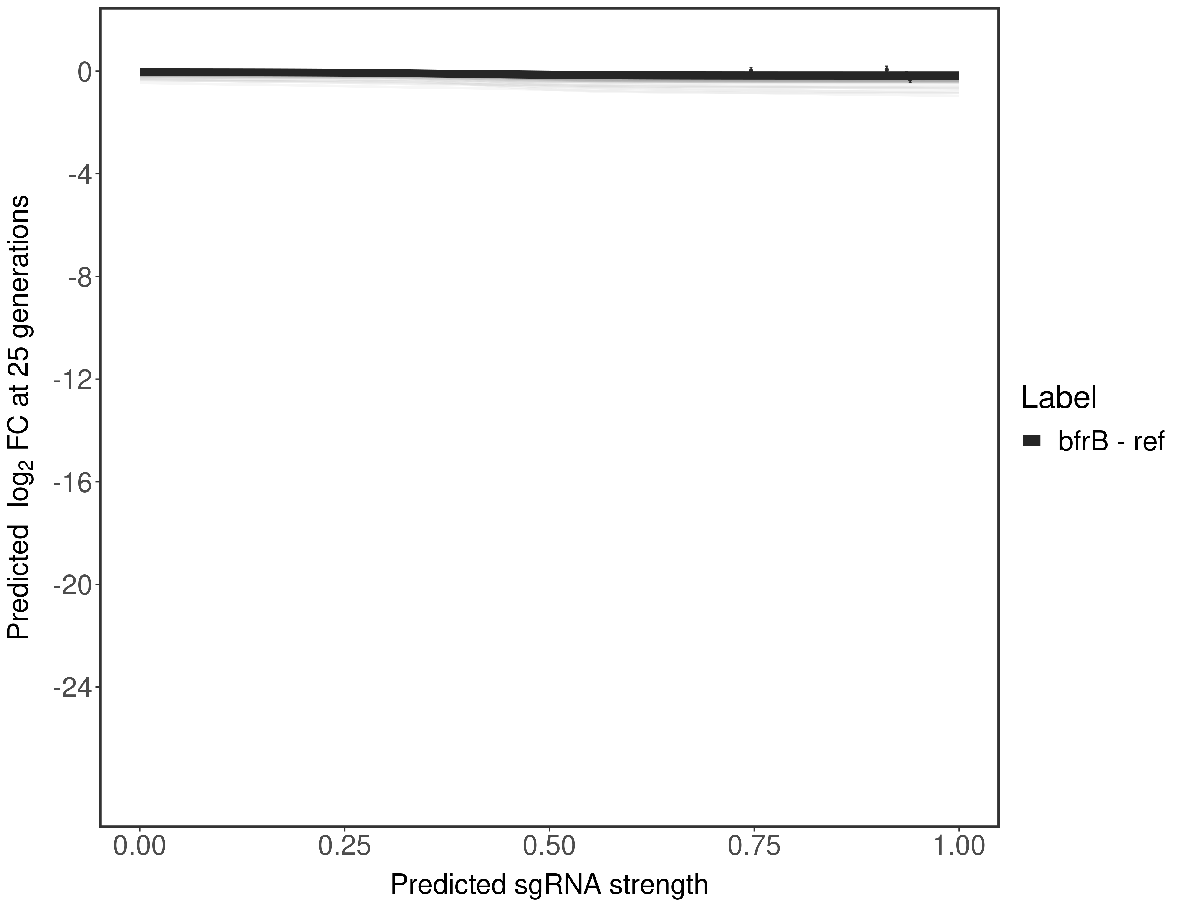 Experiment: We designed an M. tuberculosis CRISPRi library (RLC12) to target all annotated Mtb genes with single guide RNAs (sgRNAs) of varying predicted knockdown efficiencies. In parallel, we constructed a M. smegmatis CRISPRi library (RLC11) to target all annotated Msmeg genes, similar to the Mtb sgRNA library. RLC12 was transformed into M. tuberculosis H37Rv; RLC11 into M. smegmatis mc2-155. We passaged both CRISPRi libraries for nearly 30 generations in the presence or absence of the CRISPRi-inducer anhydrotetracycline (ATc). At the indicated timepoints, genomic DNA was harvested and the representation of individual sgRNAs was counted using Illumina sequencing. Here, we show sgRNA log2 fold-change values (L2FC) (plus versus minus ATc) over consecutive generations for sgRNAs targeting the gene you selected. sgRNAs are color-coded based on their predicted strength from blue (strength=0; weak) to red (strength=1; strong).