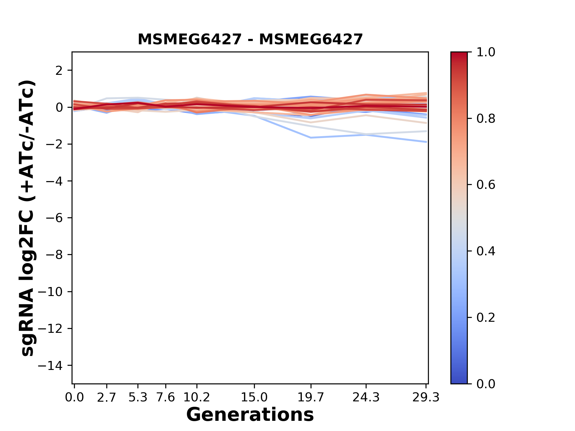 Here, we show sgRNA log2 fold-change values (L2FC) (plus versus minus ATc) over consecutive generations for sgRNAs targeting the gene you selected.