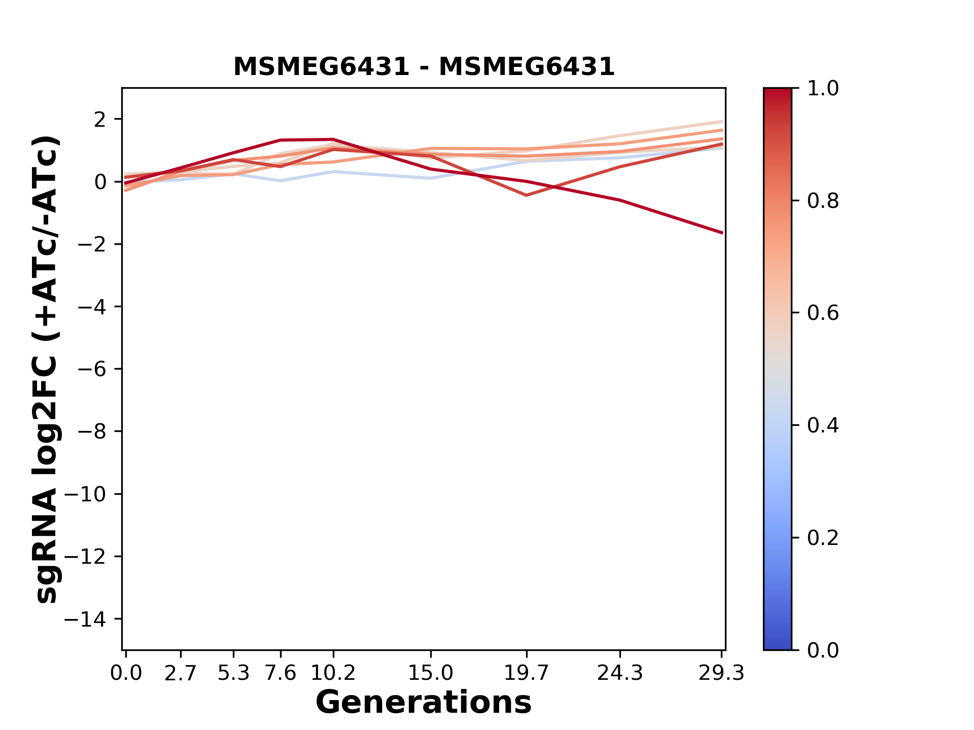 Experiment: We designed an M. tuberculosis CRISPRi library (RLC12) to target all annotated Mtb genes with single guide RNAs (sgRNAs) of varying predicted knockdown efficiencies. In parallel, we constructed a M. smegmatis CRISPRi library (RLC11) to target all annotated Msmeg genes, similar to the Mtb sgRNA library. RLC12 was transformed into M. tuberculosis H37Rv; RLC11 into M. smegmatis mc2-155. We passaged both CRISPRi libraries for nearly 30 generations in the presence or absence of the CRISPRi-inducer anhydrotetracycline (ATc). At the indicated timepoints, genomic DNA was harvested and the representation of individual sgRNAs was counted using Illumina sequencing. Here, we show sgRNA log2 fold-change values (L2FC) (plus versus minus ATc) over consecutive generations for sgRNAs targeting the gene you selected. sgRNAs are color-coded based on their predicted strength from blue (strength=0; weak) to red (strength=1; strong).
