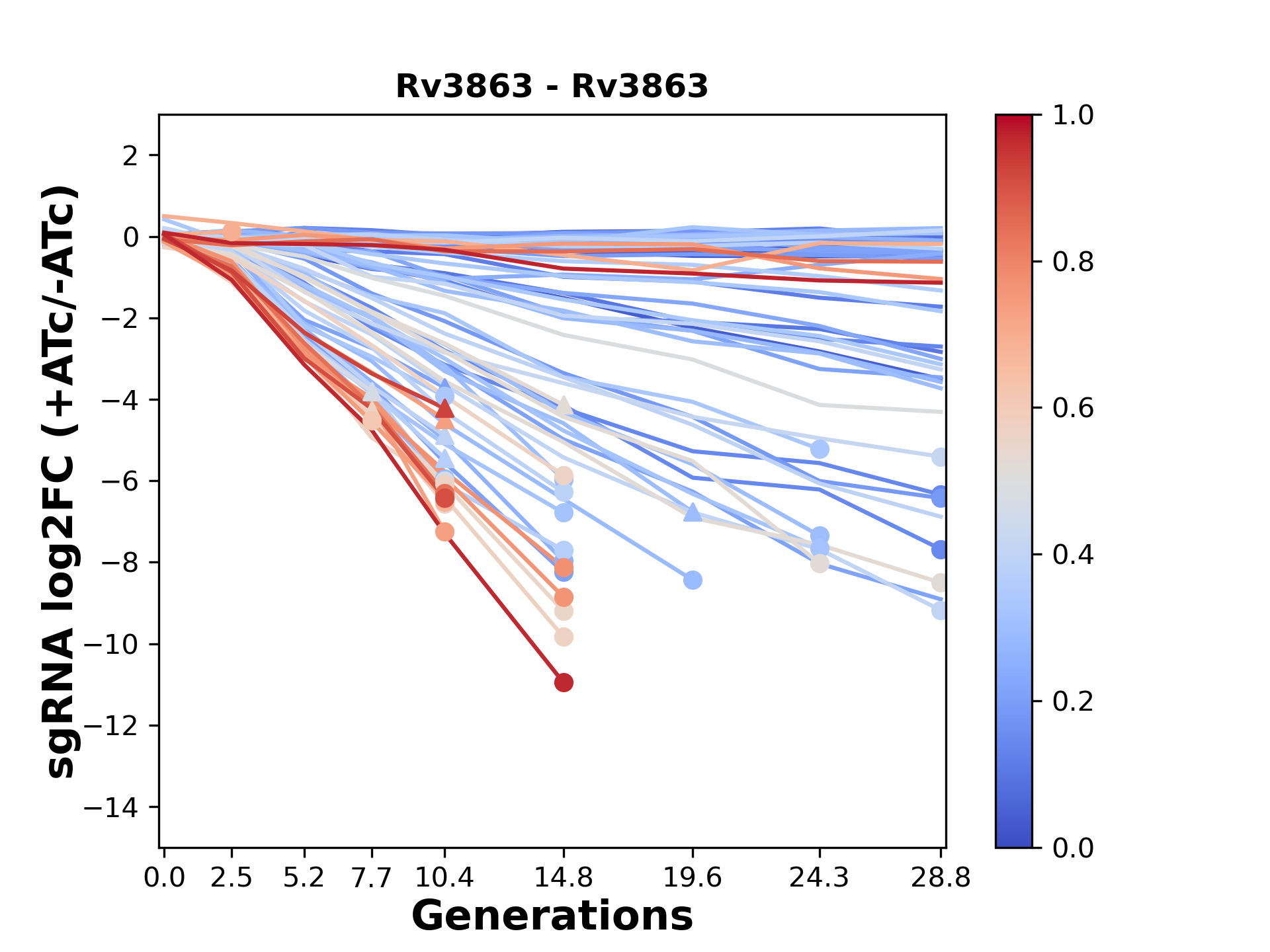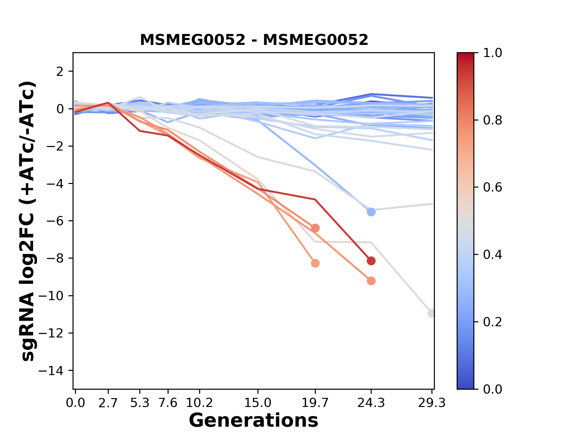 Here, we show sgRNA log2 fold-change values (L2FC) (plus versus minus ATc) over consecutive generations for sgRNAs targeting the gene you selected.