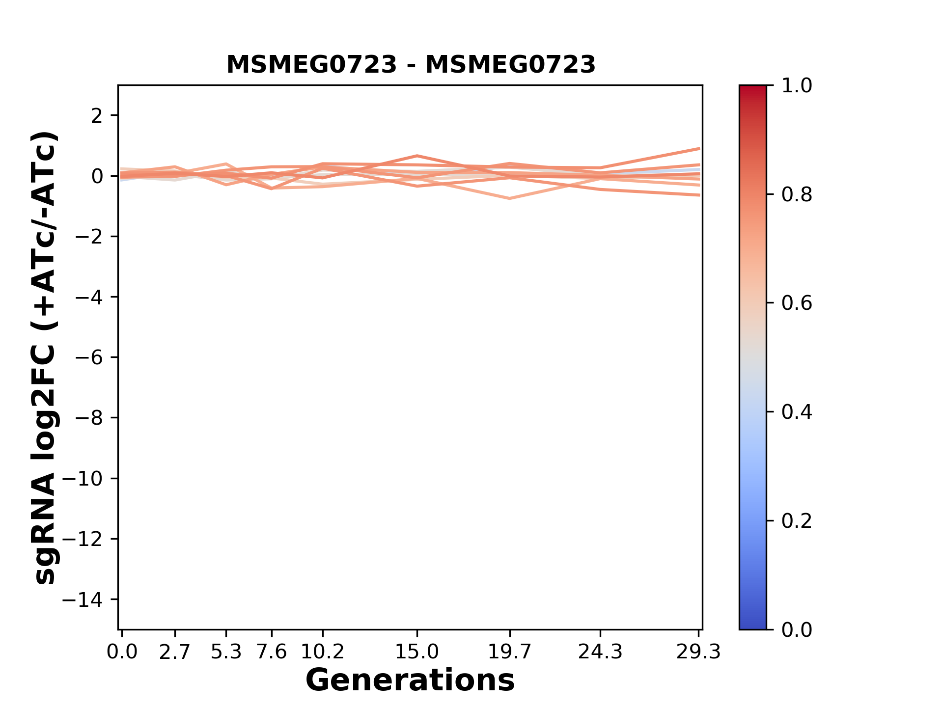 Experiment: We designed an M. tuberculosis CRISPRi library (RLC12) to target all annotated Mtb genes with single guide RNAs (sgRNAs) of varying predicted knockdown efficiencies. In parallel, we constructed a M. smegmatis CRISPRi library (RLC11) to target all annotated Msmeg genes, similar to the Mtb sgRNA library. RLC12 was transformed into M. tuberculosis H37Rv; RLC11 into M. smegmatis mc2-155. We passaged both CRISPRi libraries for nearly 30 generations in the presence or absence of the CRISPRi-inducer anhydrotetracycline (ATc). At the indicated timepoints, genomic DNA was harvested and the representation of individual sgRNAs was counted using Illumina sequencing. Here, we show sgRNA log2 fold-change values (L2FC) (plus versus minus ATc) over consecutive generations for sgRNAs targeting the gene you selected. sgRNAs are color-coded based on their predicted strength from blue (strength=0; weak) to red (strength=1; strong).