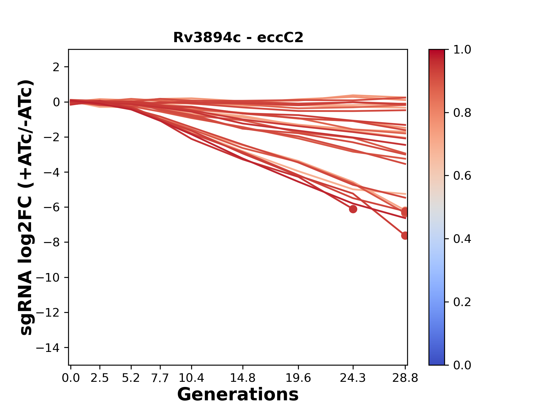 Here, we show sgRNA log2 fold-change values (L2FC) (plus versus minus ATc) over consecutive generations for sgRNAs targeting the gene you selected.