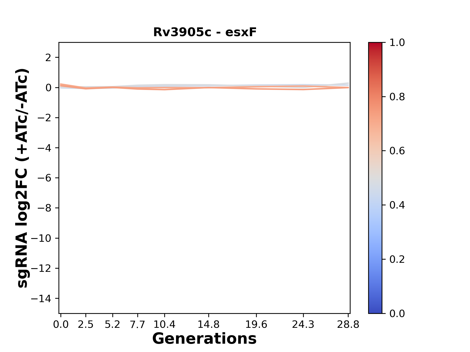 Experiment: We designed an M. tuberculosis CRISPRi library (RLC12) to target all annotated Mtb genes with single guide RNAs (sgRNAs) of varying predicted knockdown efficiencies. In parallel, we constructed a M. smegmatis CRISPRi library (RLC11) to target all annotated Msmeg genes, similar to the Mtb sgRNA library. RLC12 was transformed into M. tuberculosis H37Rv; RLC11 into M. smegmatis mc2-155. We passaged both CRISPRi libraries for nearly 30 generations in the presence or absence of the CRISPRi-inducer anhydrotetracycline (ATc). At the indicated timepoints, genomic DNA was harvested and the representation of individual sgRNAs was counted using Illumina sequencing. Here, we show sgRNA log2 fold-change values (L2FC) (plus versus minus ATc) over consecutive generations for sgRNAs targeting the gene you selected. sgRNAs are color-coded based on their predicted strength from blue (strength=0; weak) to red (strength=1; strong).