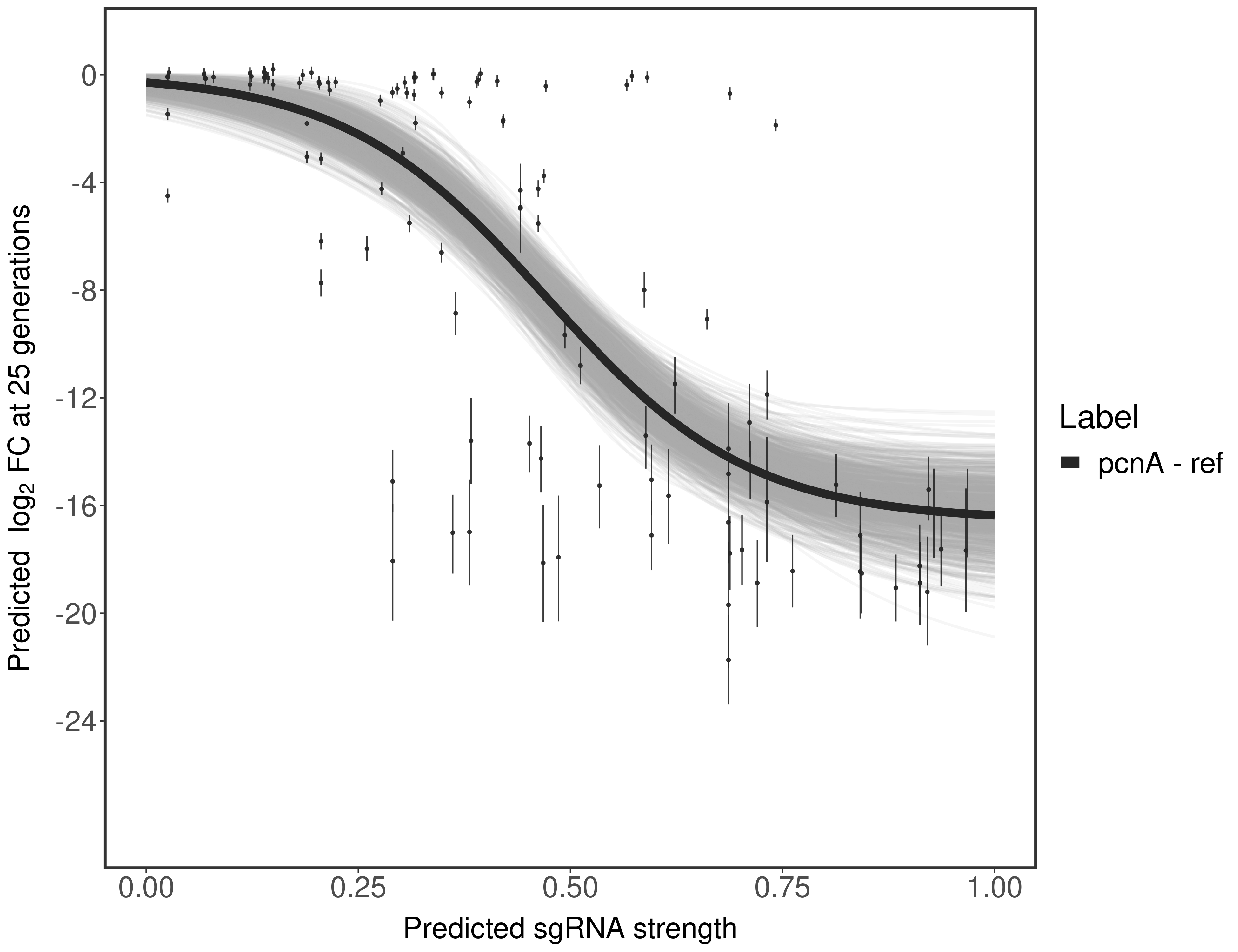 In order to quantify gene vulnerability, data were subsequently analyzed with a hierarchical model at the sgRNA level (two-line model) and gene level (Hill curve). The vulnerability quantification is shown below. [More information]