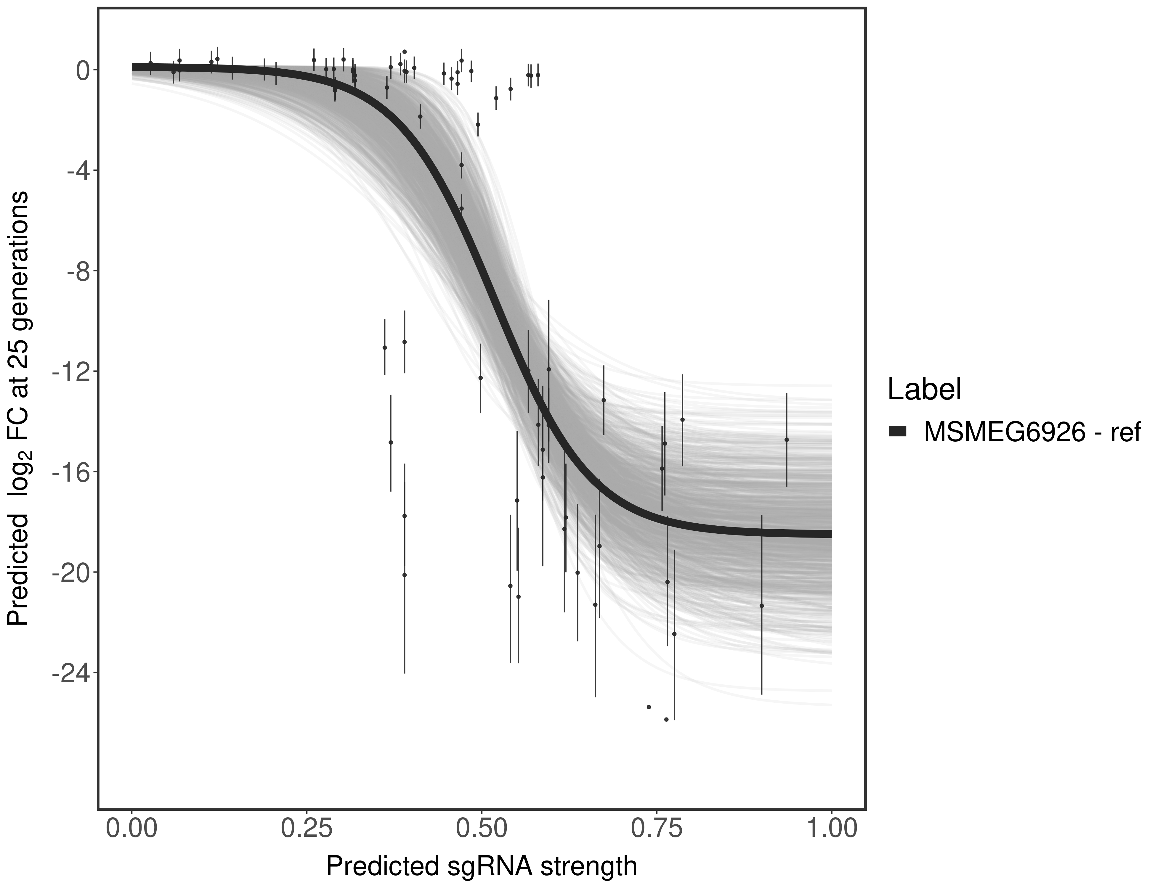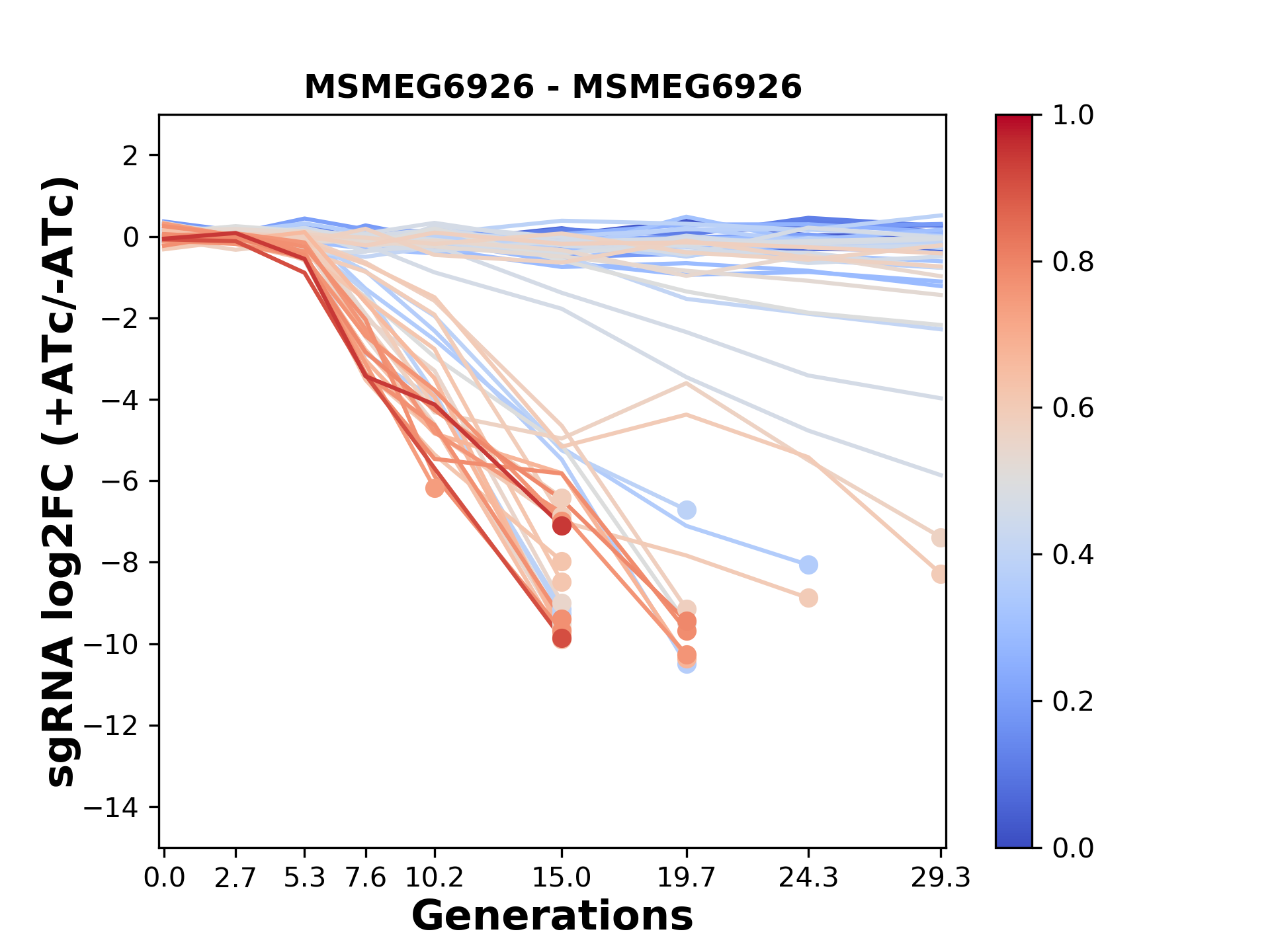 Experiment: We designed an M. tuberculosis CRISPRi library (RLC12) to target all annotated Mtb genes with single guide RNAs (sgRNAs) of varying predicted knockdown efficiencies. In parallel, we constructed a M. smegmatis CRISPRi library (RLC11) to target all annotated Msmeg genes, similar to the Mtb sgRNA library. RLC12 was transformed into M. tuberculosis H37Rv; RLC11 into M. smegmatis mc2-155. We passaged both CRISPRi libraries for nearly 30 generations in the presence or absence of the CRISPRi-inducer anhydrotetracycline (ATc). At the indicated timepoints, genomic DNA was harvested and the representation of individual sgRNAs was counted using Illumina sequencing. Here, we show sgRNA log2 fold-change values (L2FC) (plus versus minus ATc) over consecutive generations for sgRNAs targeting the gene you selected. sgRNAs are color-coded based on their predicted strength from blue (strength=0; weak) to red (strength=1; strong).