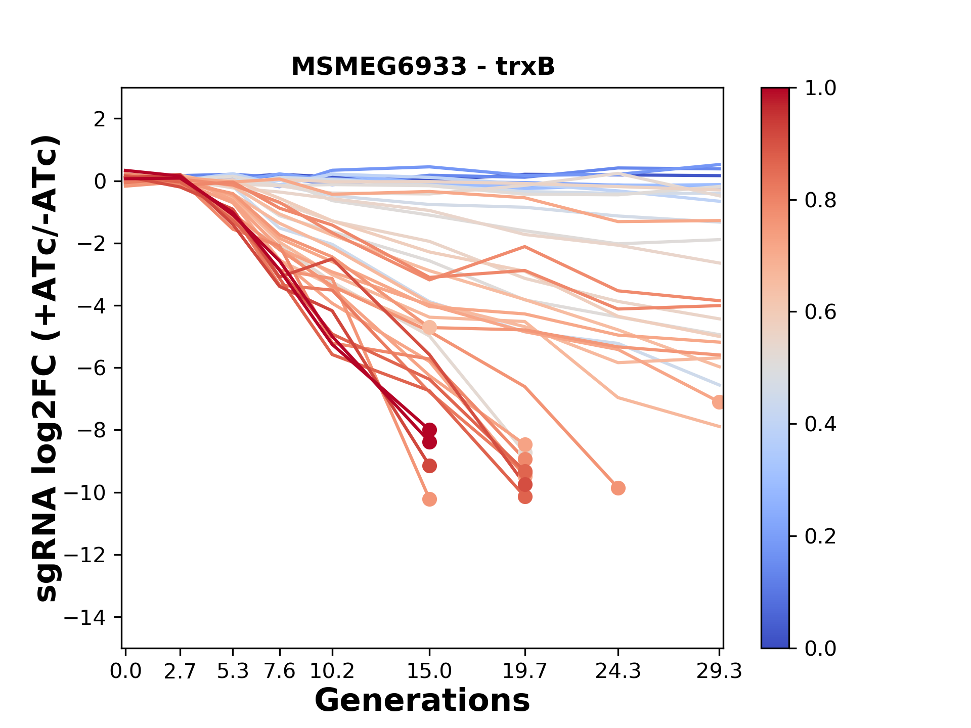 Here, we show sgRNA log2 fold-change values (L2FC) (plus versus minus ATc) over consecutive generations for sgRNAs targeting the gene you selected.
