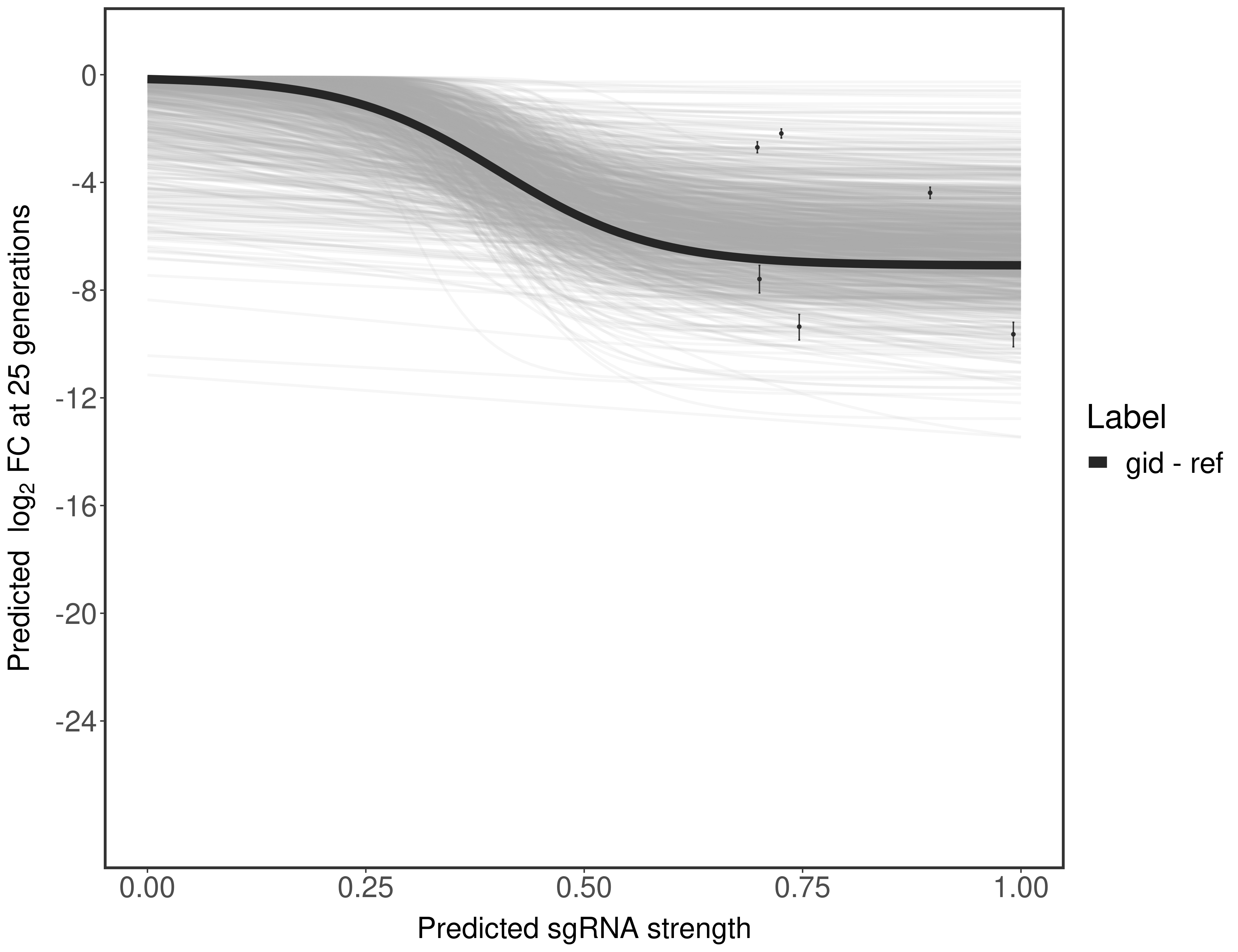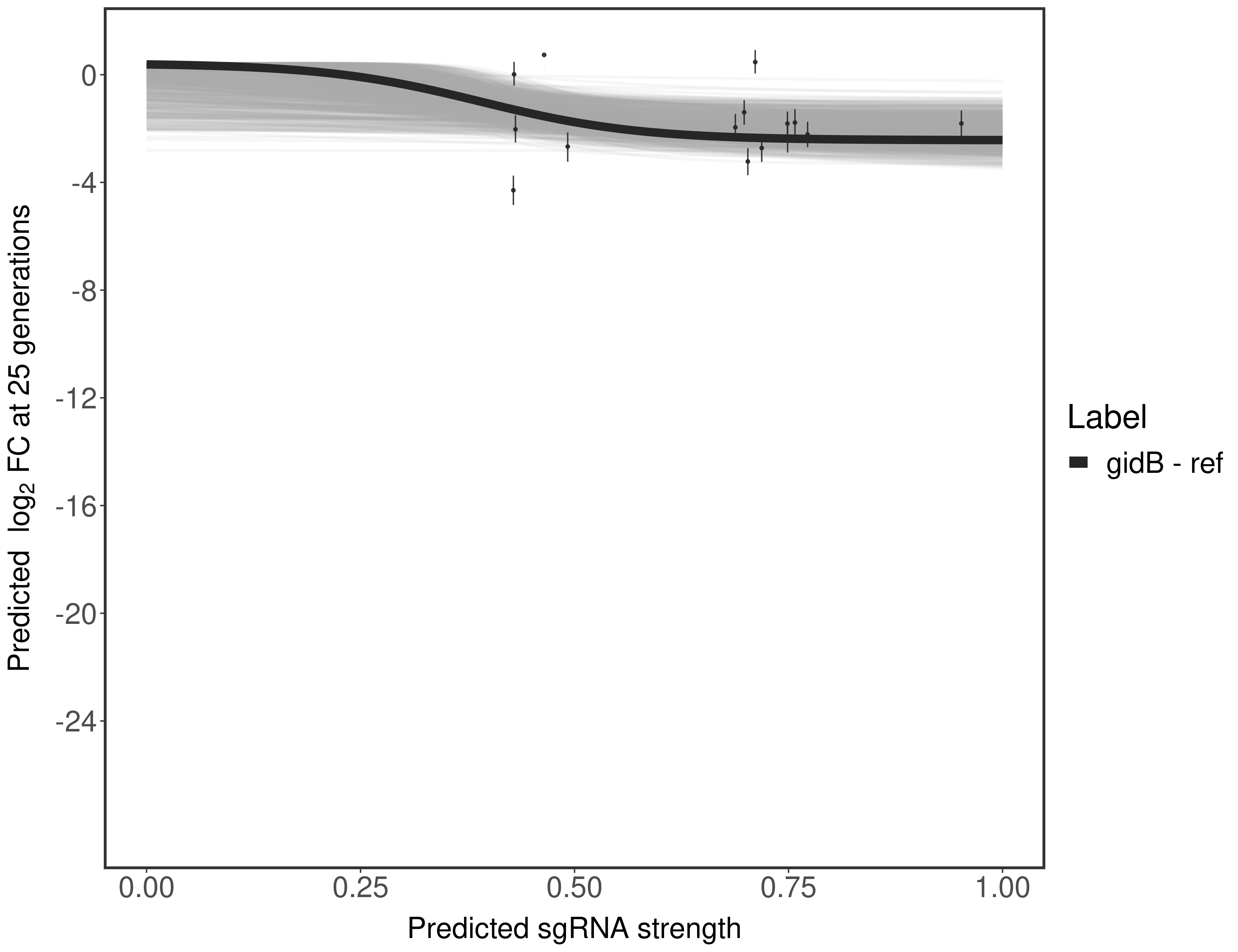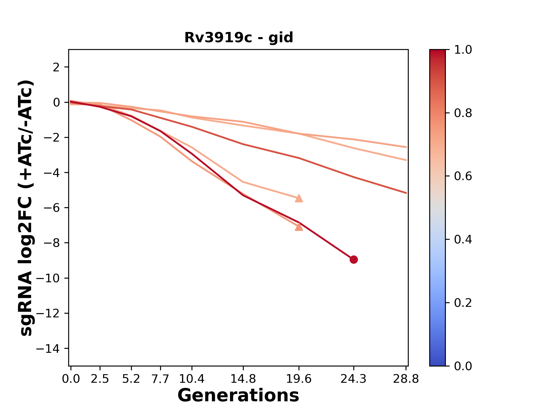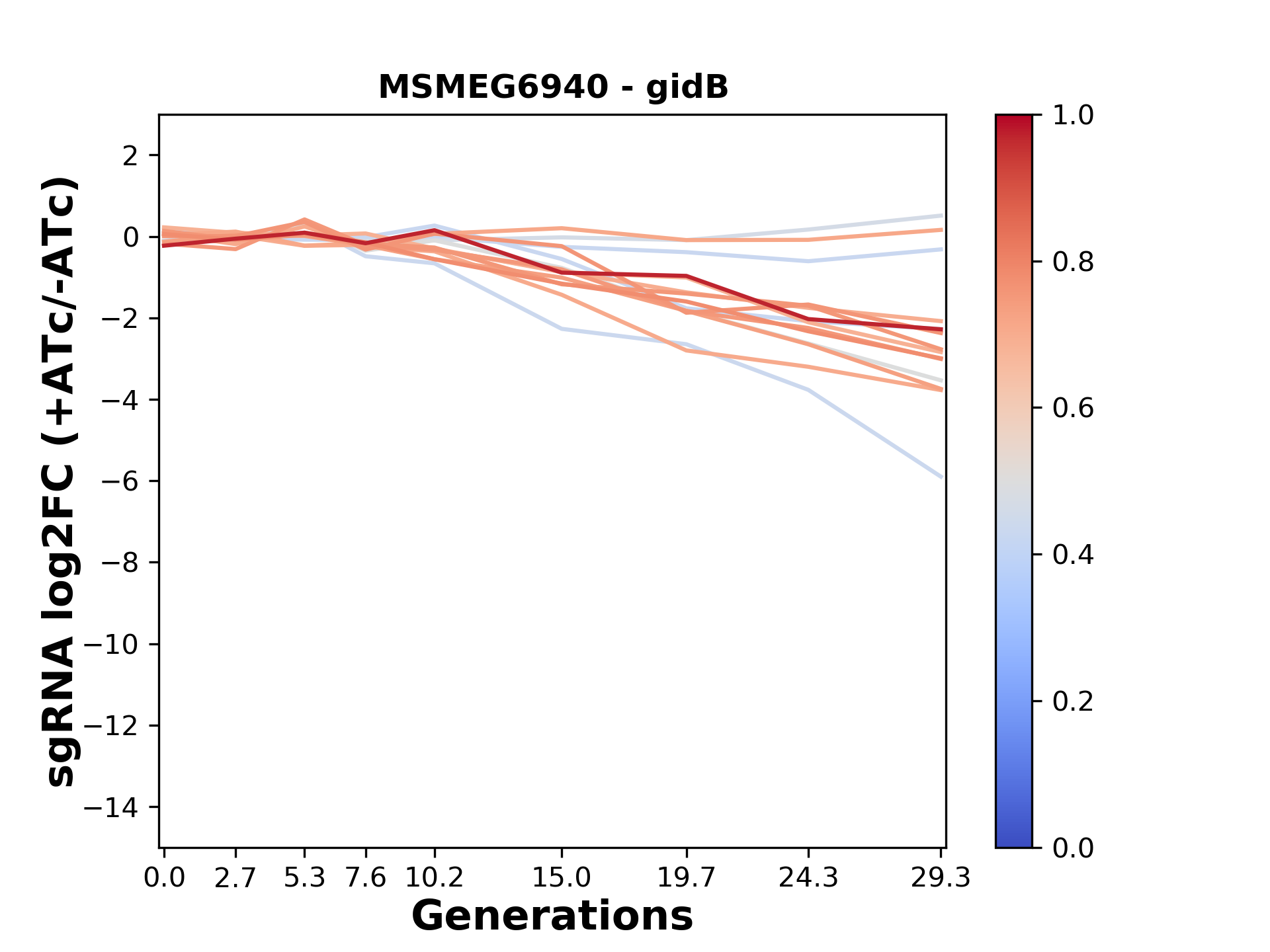 Here, we show sgRNA log2 fold-change values (L2FC) (plus versus minus ATc) over consecutive generations for sgRNAs targeting the gene you selected.