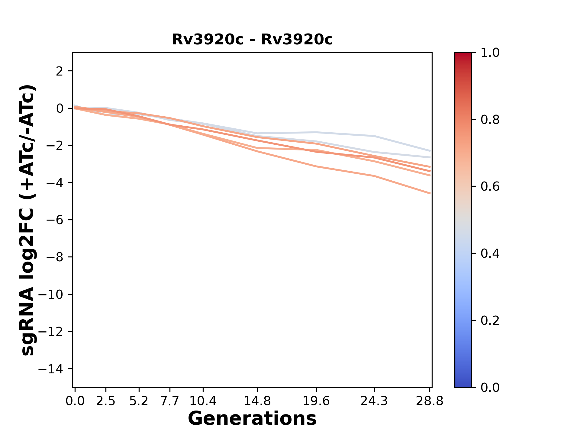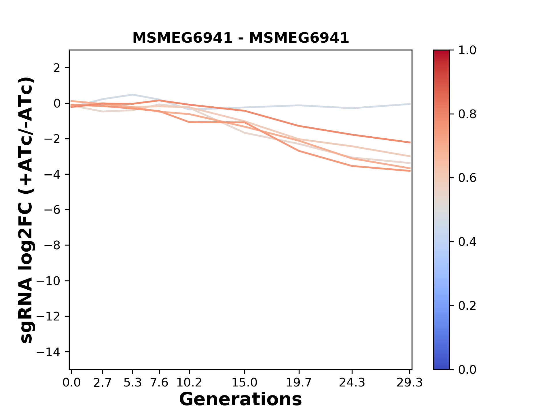 Here, we show sgRNA log2 fold-change values (L2FC) (plus versus minus ATc) over consecutive generations for sgRNAs targeting the gene you selected.
