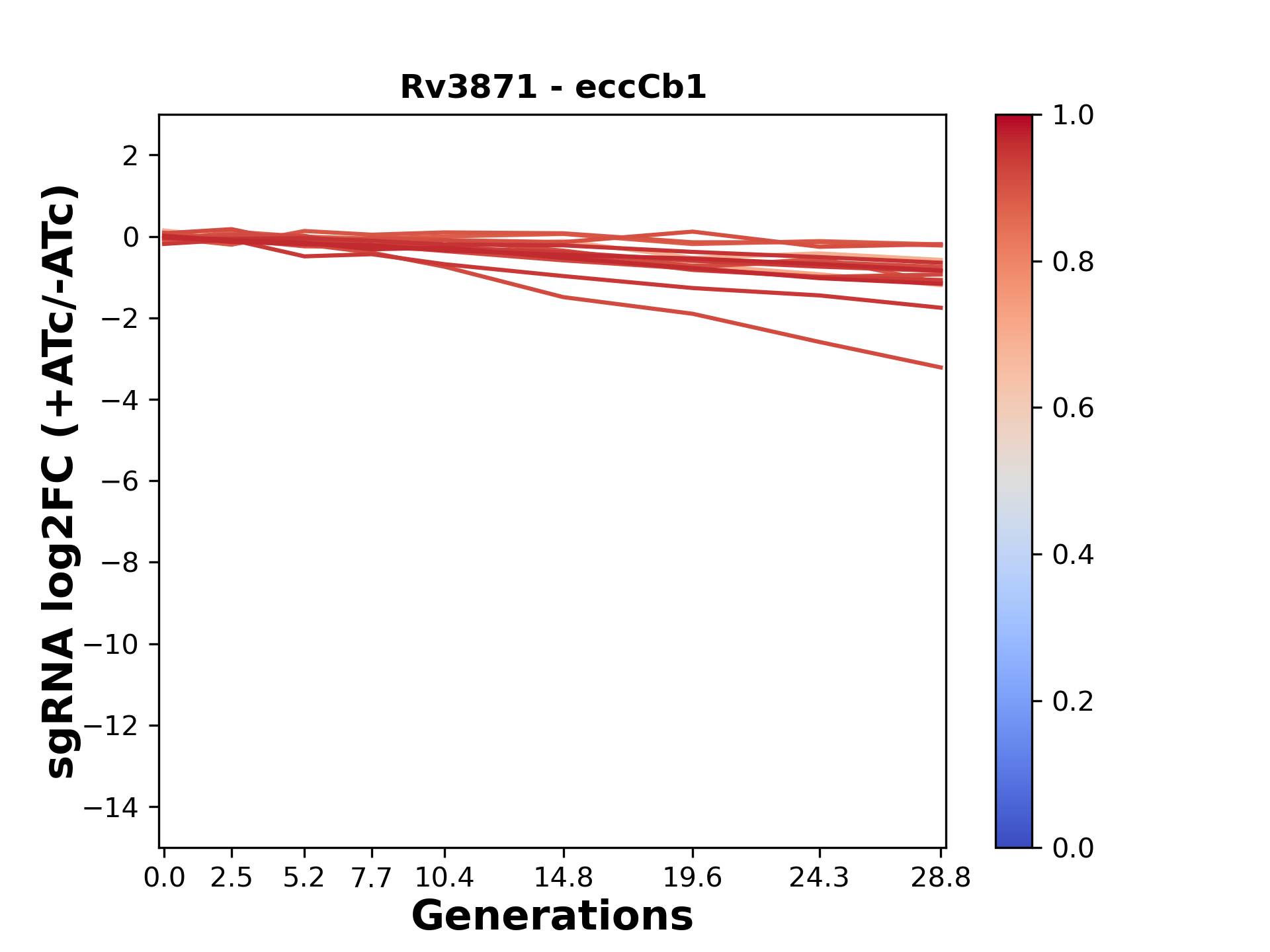 Here, we show sgRNA log2 fold-change values (L2FC) (plus versus minus ATc) over consecutive generations for sgRNAs targeting the gene you selected.