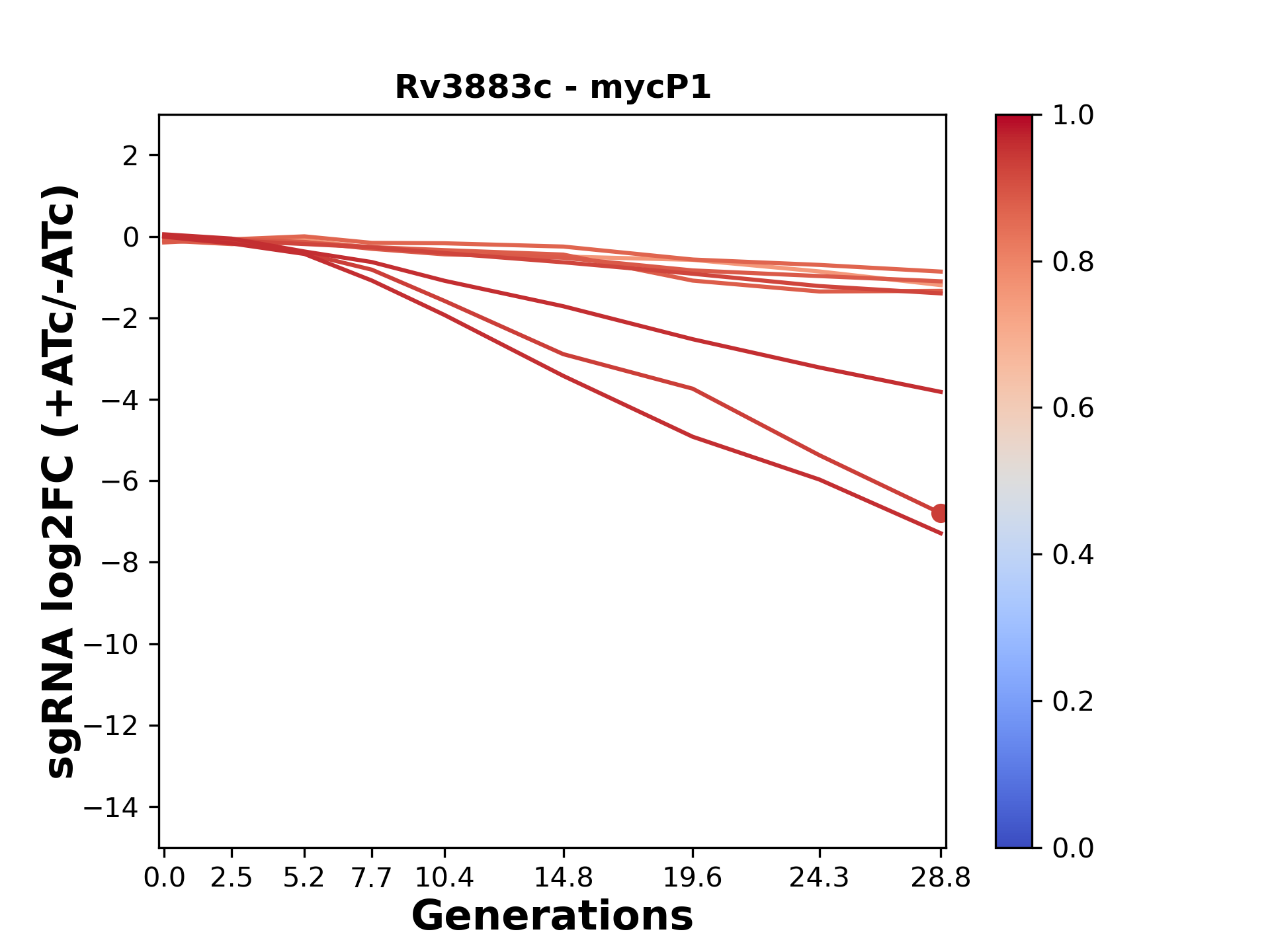 Here, we show sgRNA log2 fold-change values (L2FC) (plus versus minus ATc) over consecutive generations for sgRNAs targeting the gene you selected.
