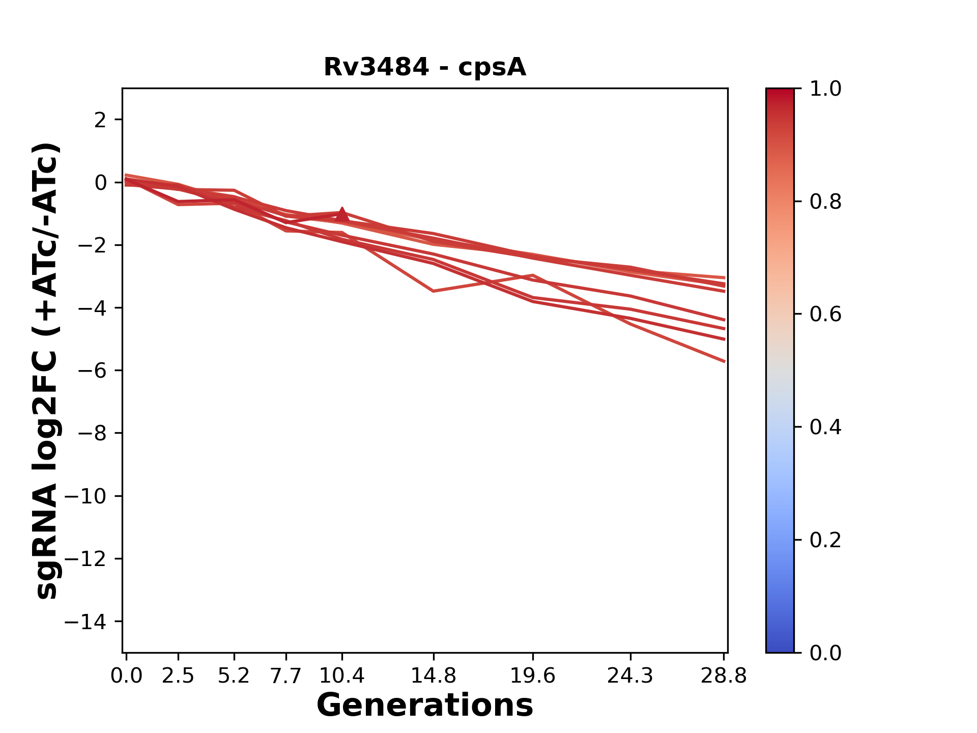 Here, we show sgRNA log2 fold-change values (L2FC) (plus versus minus ATc) over consecutive generations for sgRNAs targeting the gene you selected.