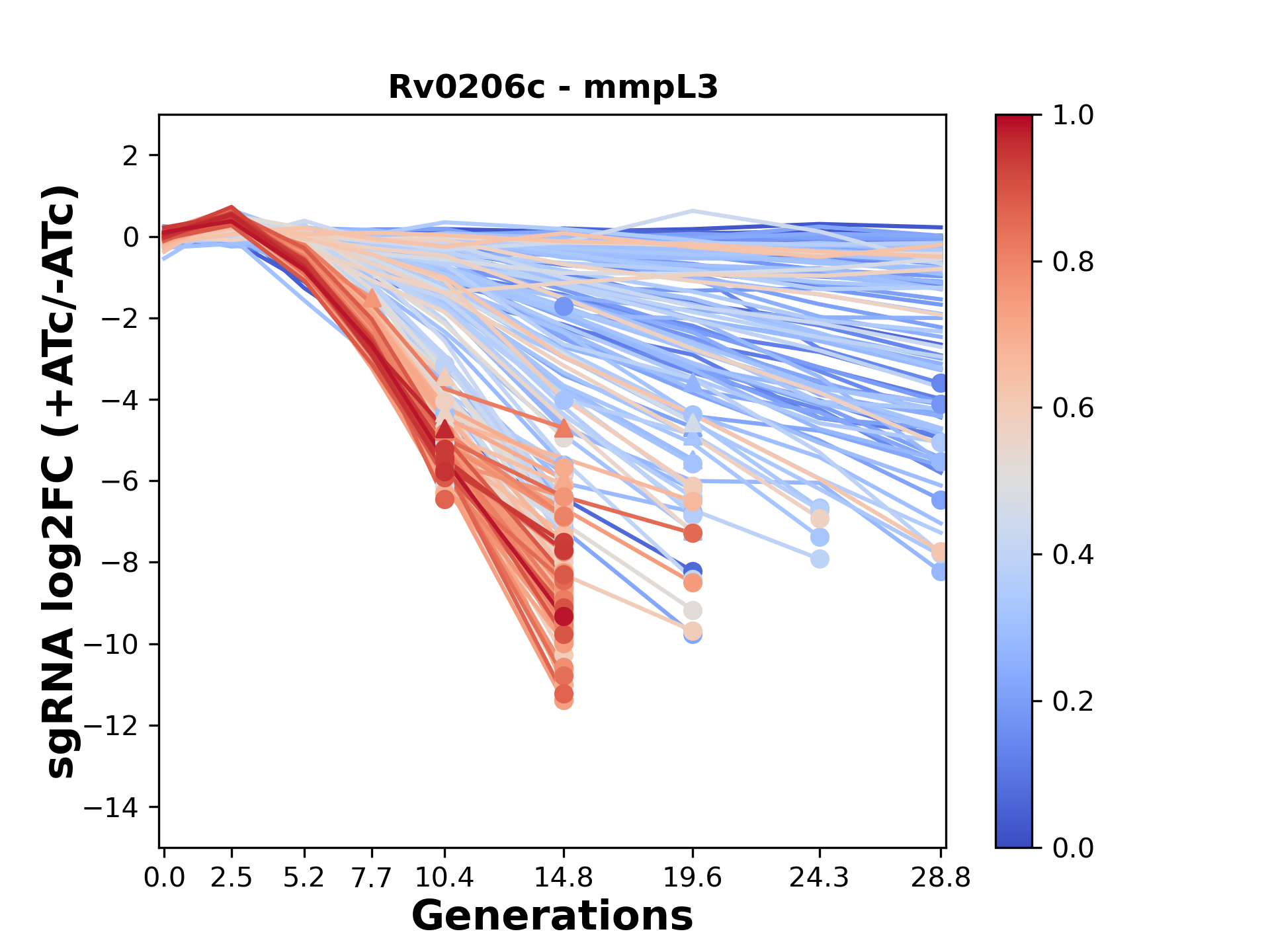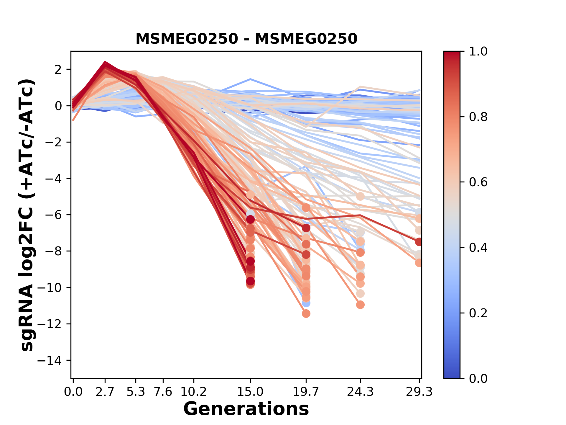 Here, we show sgRNA log2 fold-change values (L2FC) (plus versus minus ATc) over consecutive generations for sgRNAs targeting the gene you selected.
